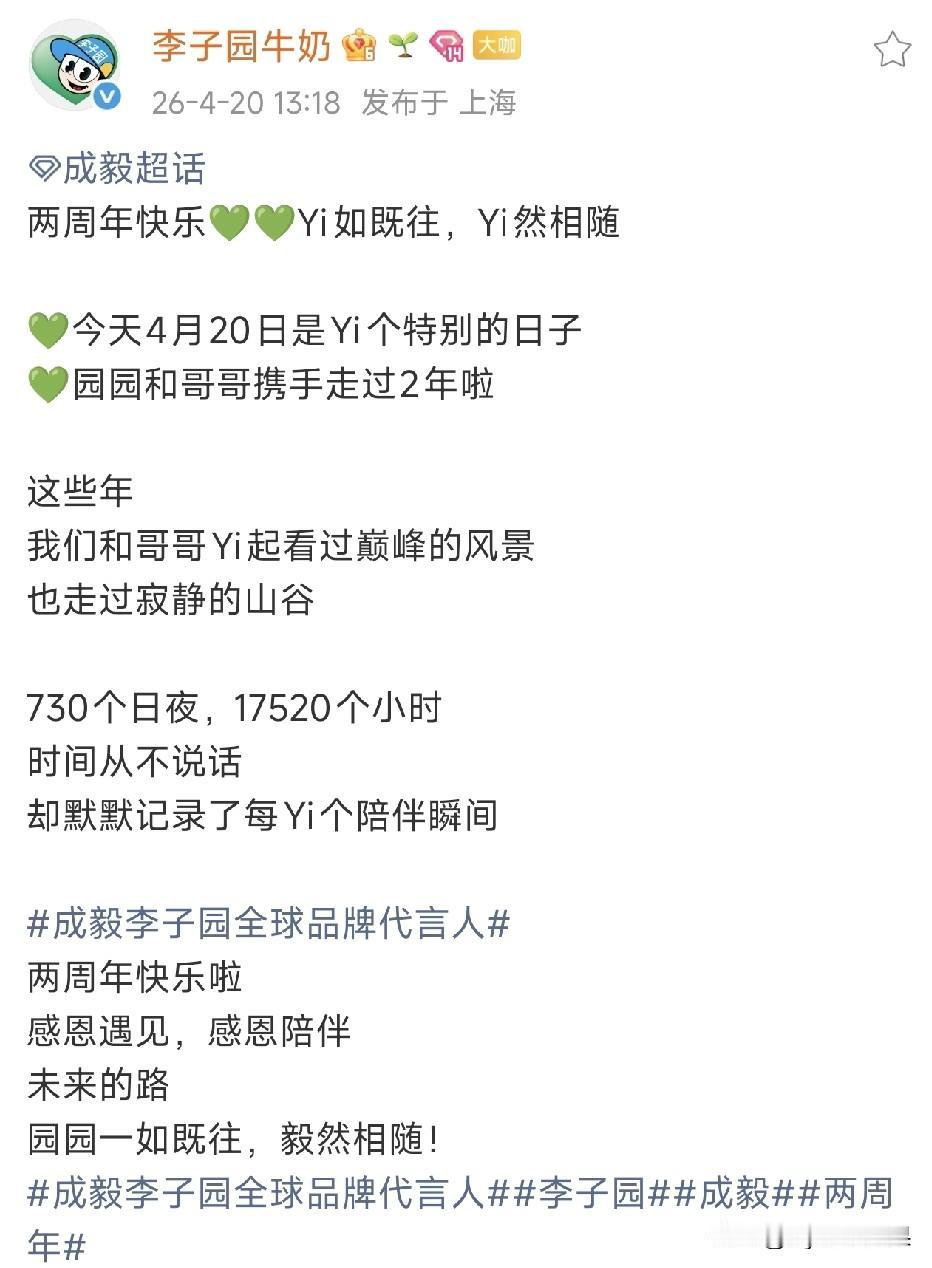 李子园的文案真的很用心,从官宣成为全球品牌代言人的那天起,转眼就和哥哥一起走过了整整两年的时光。730个日夜,17520个小时,每一个陪伴的瞬间,都被好好记录着。