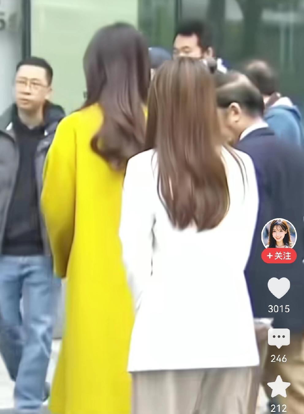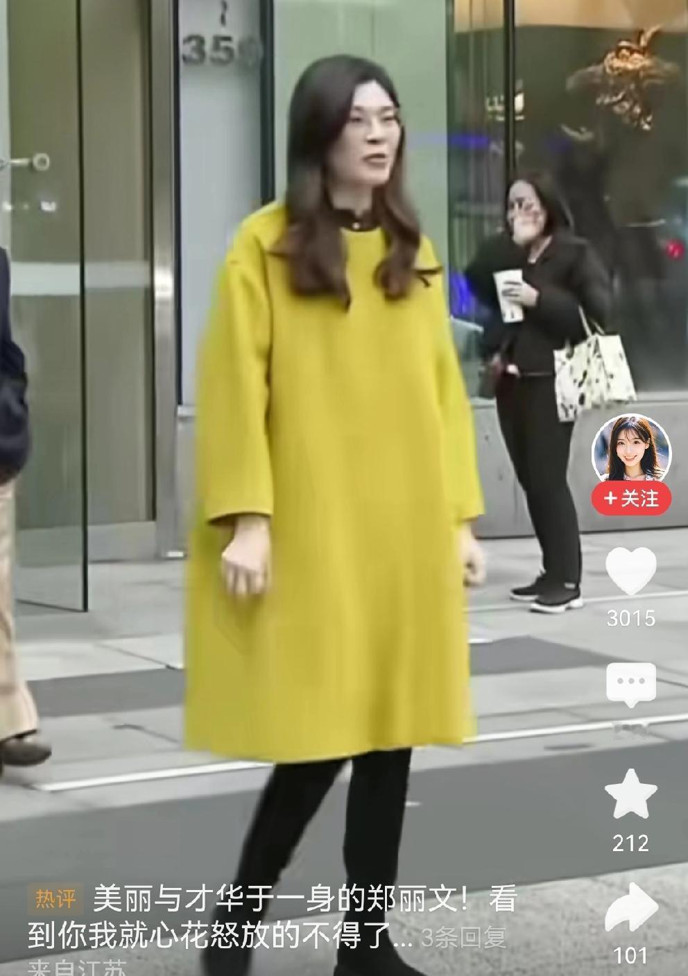 明黄色的大衣搭配黑色窄腿裤,再配上一双黑色皮鞋……明黄色衬得她肤白貌美。
