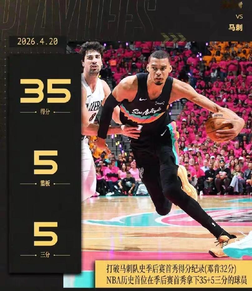 今天季后赛首战,马刺主场以111-98完胜开拓者,22岁的文班亚马,迎来职业生涯季后赛首秀,全场无人能挡,轻松砍下35分/5篮板/2盖帽,打破前辈邓肯,尘封多年的队史首秀得分纪录(32分)。