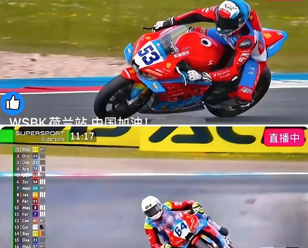 赛场上,张雪机车的53号瓦伦丁和64号卡里卡苏洛,对上钱江摩托的3号拉法埃莱和24号马科斯,场面一度非常微妙。