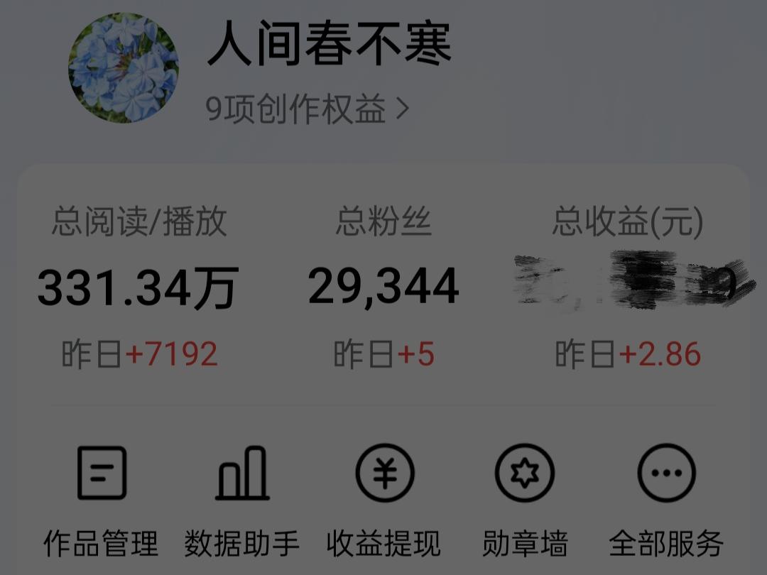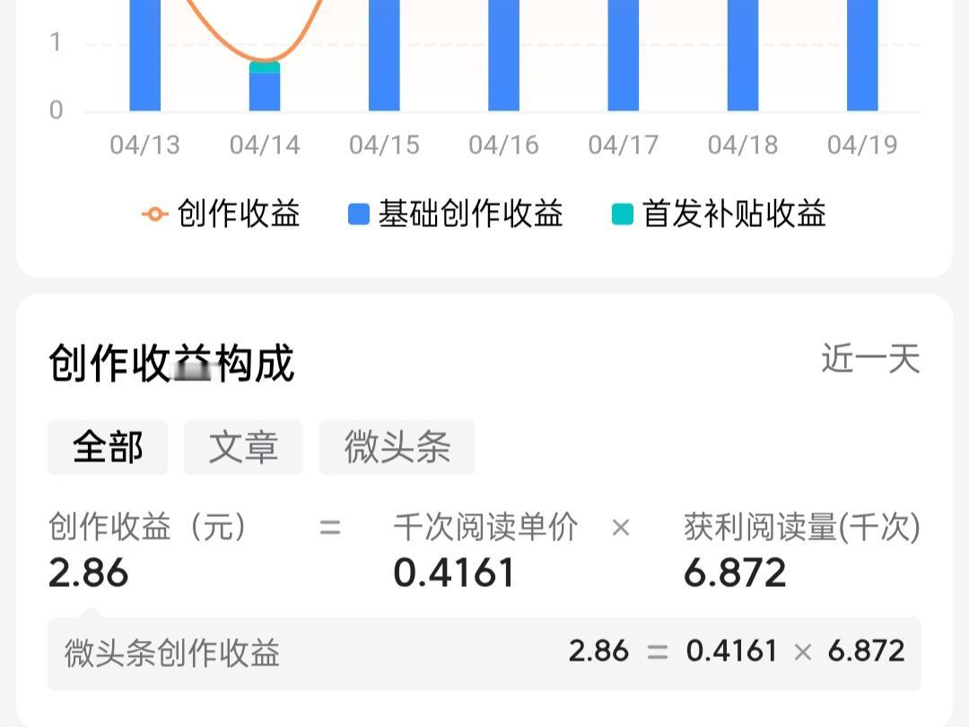 今日头条创作收益2.86元,文章阅读量7192,新增粉丝5位,千次阅读单价0.4161。