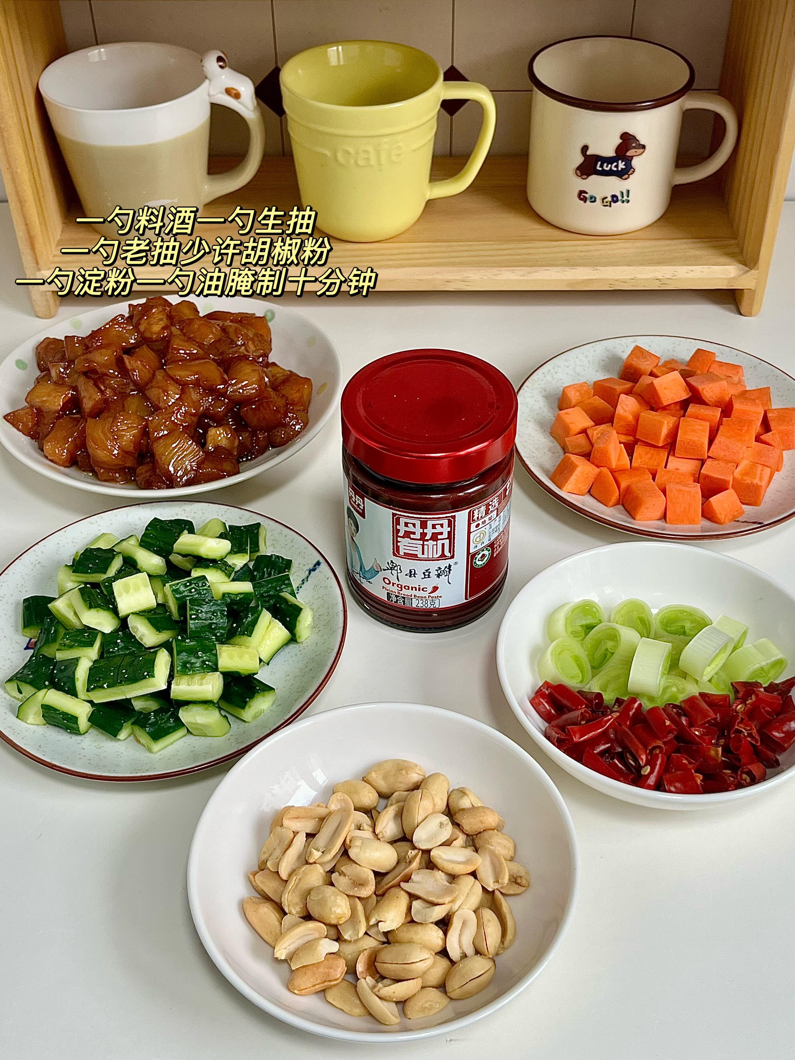- 鸡胸肉切成均匀的小丁,加入1勺料酒、1勺生抽、1勺老抽、少许胡椒粉、1勺淀粉、1勺食用油,用手抓匀,腌制10分钟(这样鸡肉更滑嫩,不柴不发老);黄瓜、胡萝卜切成小丁,葱、红辣椒切成段,再准备一碟熟花生米备用。