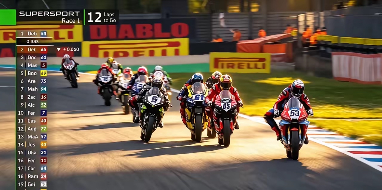张雪机车53号,前面一直领跑,拉开后面车手很长一段距离!就第9圈后突然掉速了,掉到了第5位!后面最后2圈的时候,又拉到第一了的!