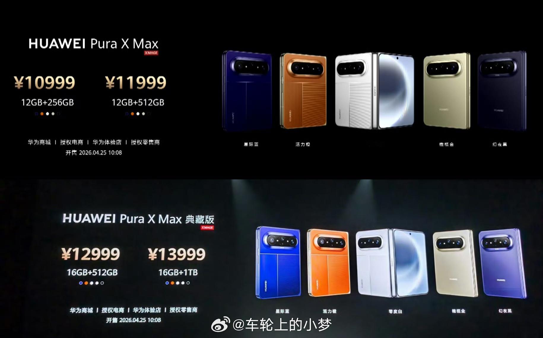 华为PuraXMax价格 正式公布,10999元起。作为全球首款大阔折形态手机,这次直接给出了四个版本:12GB+256GB、12GB+512GB、16GB+512GB典藏版、16GB+1TB典藏版,最高到13999元。配色挺丰富,幻夜黑、星际蓝、零度白、橄榄金、活力橙都有。配置上也不含糊,超可靠折叠玄武架构、第二代红枫影像系统都给到了,还支持手写笔操作。更惊喜的是AI灵感妙创和小艺伴随式AI,对喜欢折腾新形态手机的朋友来说,确实多了不少可玩性。华为大阔折售价10999元起