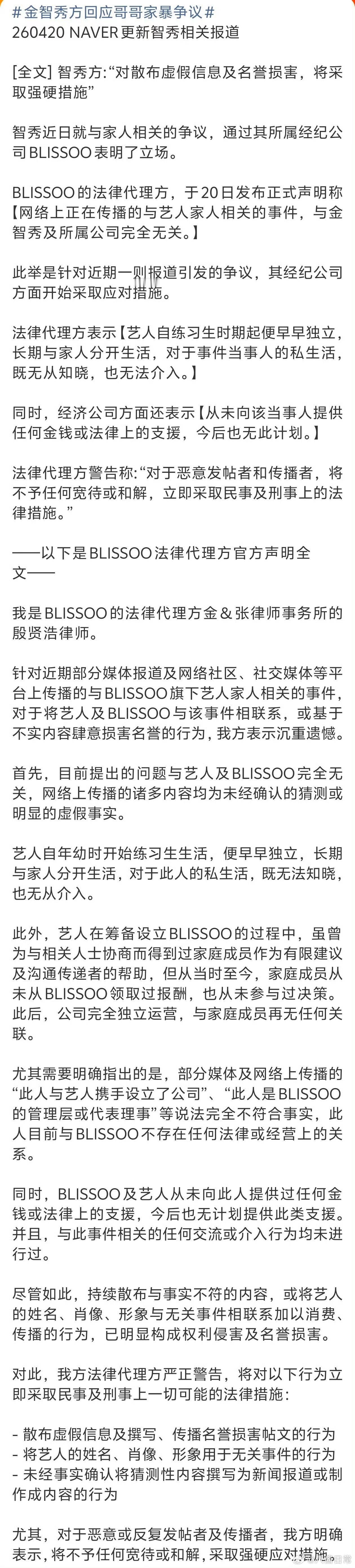 金智秀方回应金智秀哥哥家暴一事,表示金智秀从练习生时期就开始独立,长期与家人分开生活,对于事件当事人的私生活并不了解,也无法介入。且从未向该当事人提供任何金钱或法律上的支持,今后也无此计划