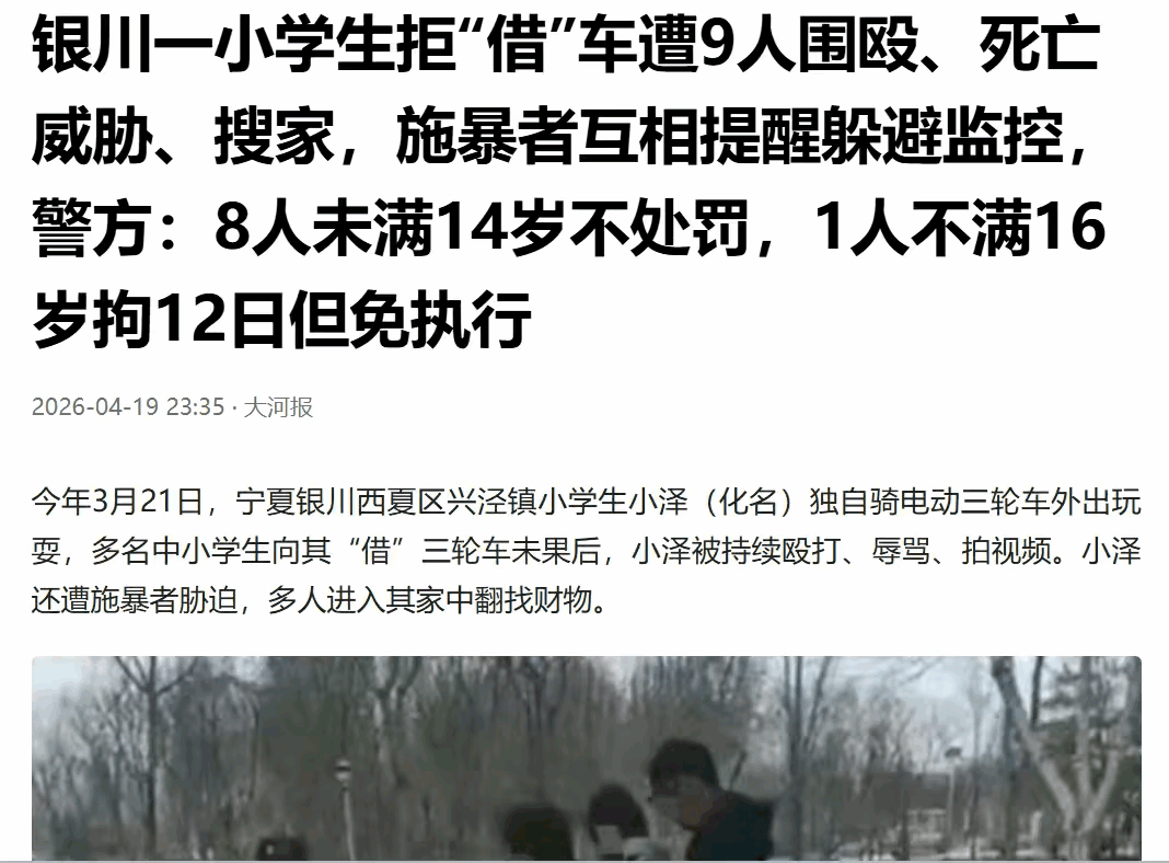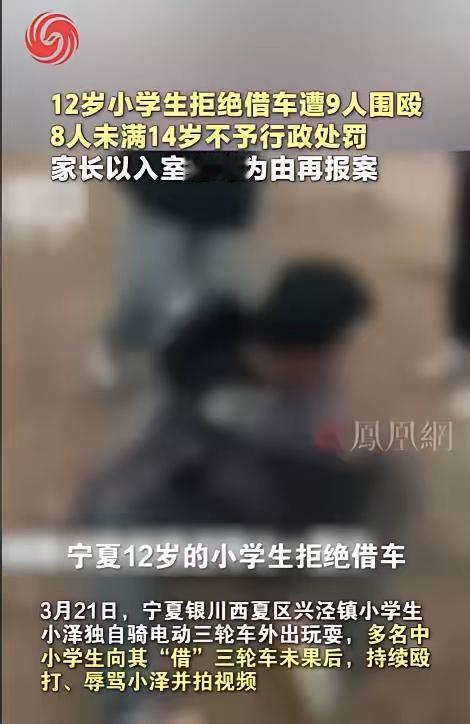 今年3月21日,宁夏银川西夏区兴泾镇小学生小泽(化名)独自骑电动三轮车外出玩耍,多名中小学生向其“借”三轮车未果后,小泽被持续殴打、辱骂、拍视频。小泽还遭施暴者胁迫,多人进入其家中翻找财物。