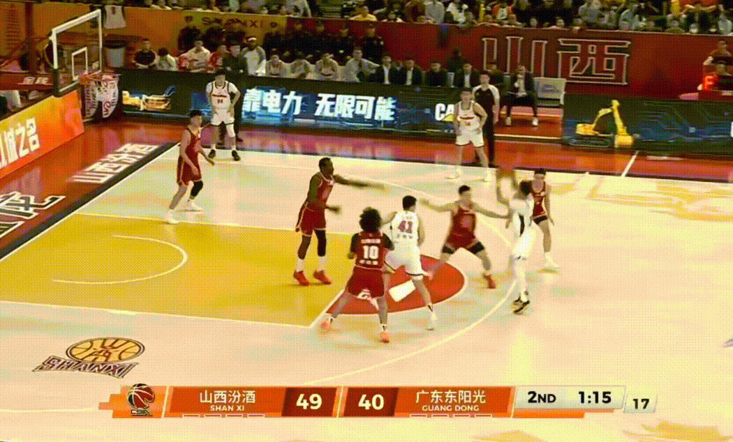广东队终于进三分了,来自好久没上场的张文逸,文逸上来连拿5分还是非常止血,广东队落后3分结束上半场 山西男篮vs广东男篮