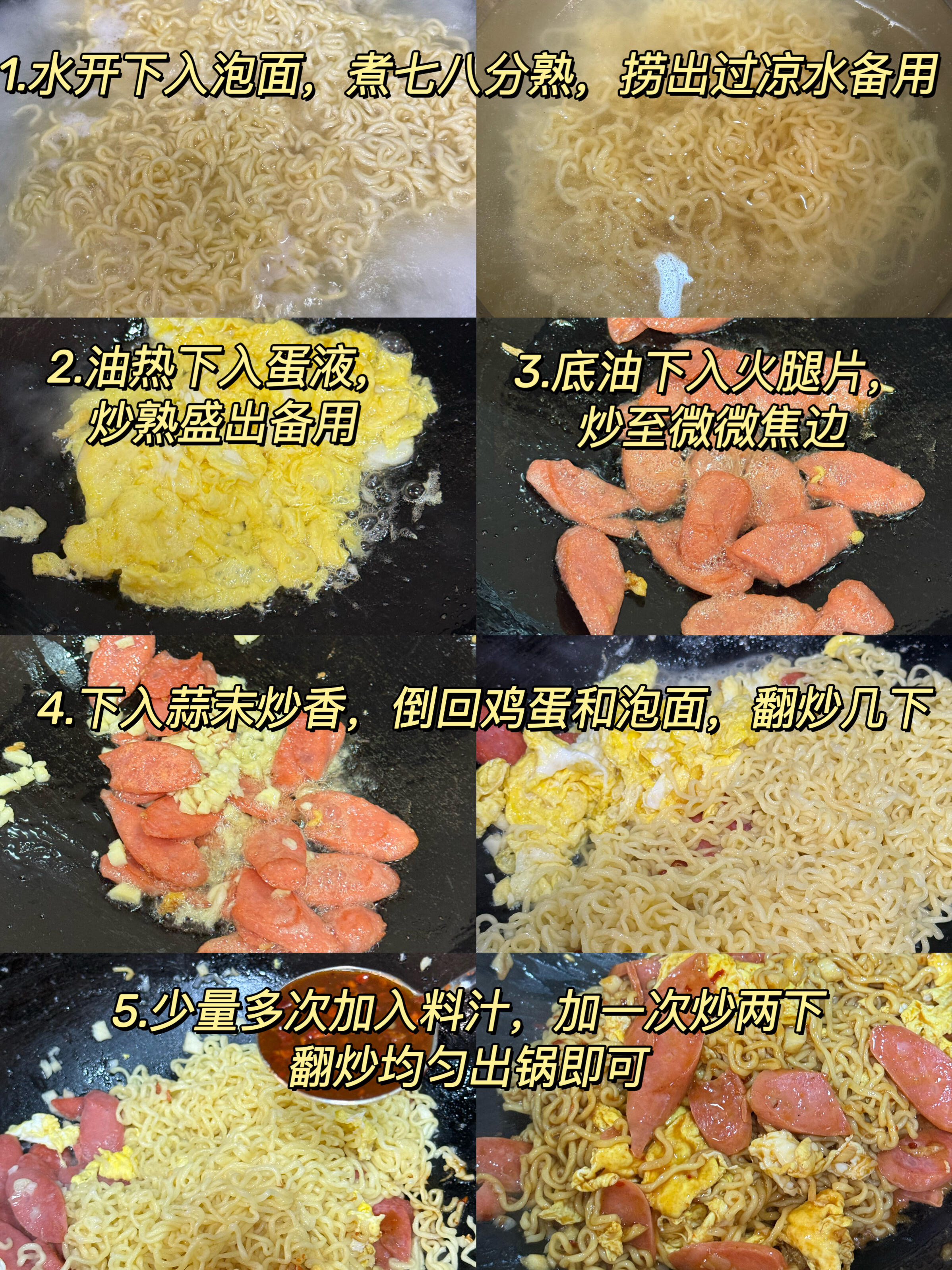 4. 锅中再放少许油,下入蒜末炒出香味,接着倒回之前炒好的鸡蛋和火腿,再加入沥干的泡面,快速翻炒几下,让食材混合均匀。