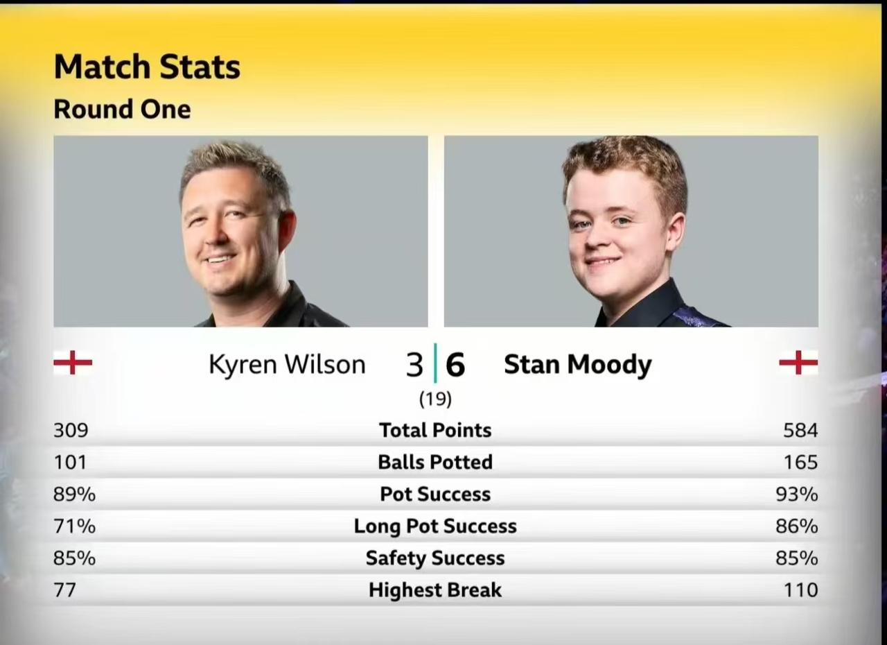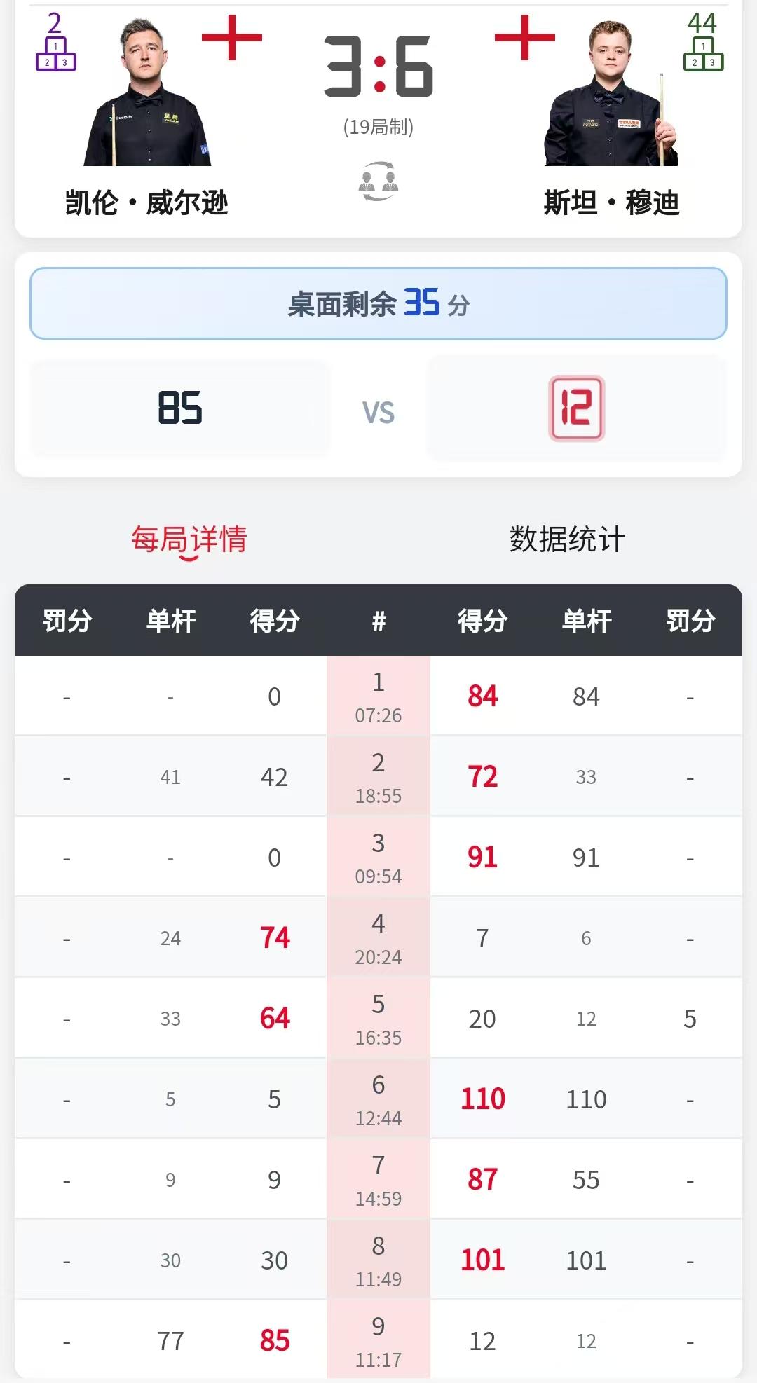 另外一场比赛穆迪对阵囧哥威尔逊,囧哥状态低迷,穆迪无所畏惧,长台有声有色,围球也还不错。目前穆迪6-3领先凯伦威尔逊。