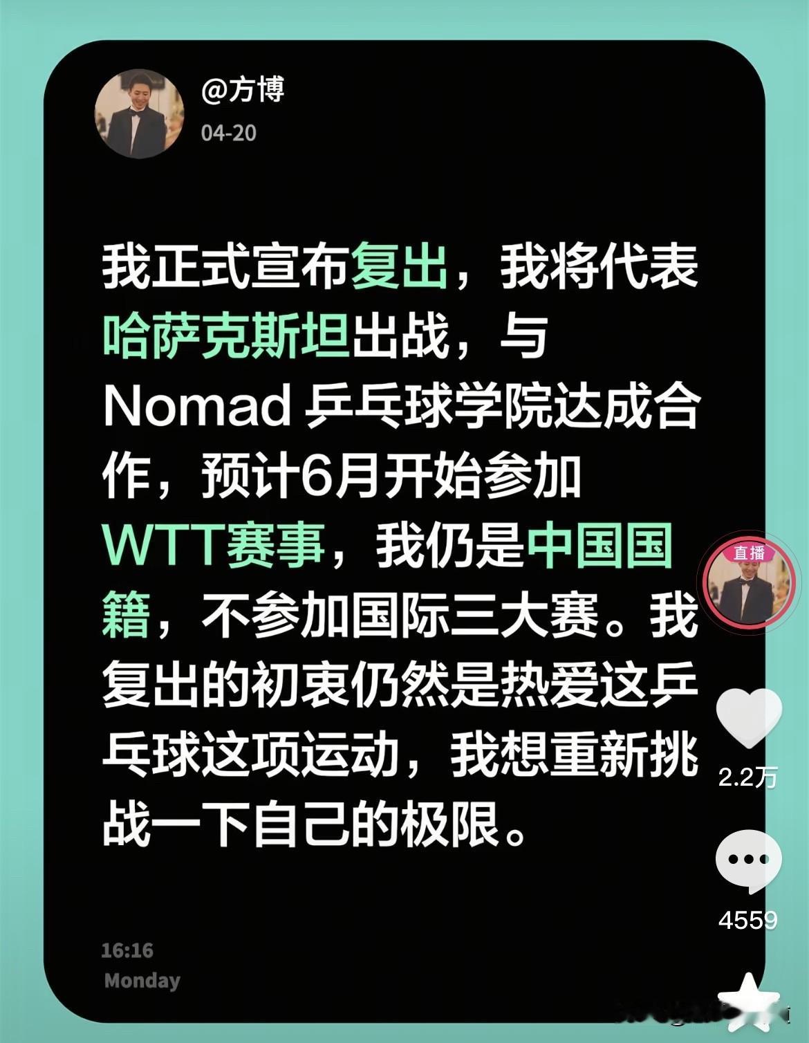 所以呢?方博参赛的经费也有了,教练组也有了[笑哭]方博今晚的直播间说这个是Nomad乒乓球学院合作项目,所以一切迎刃而解[赞][赞][赞]