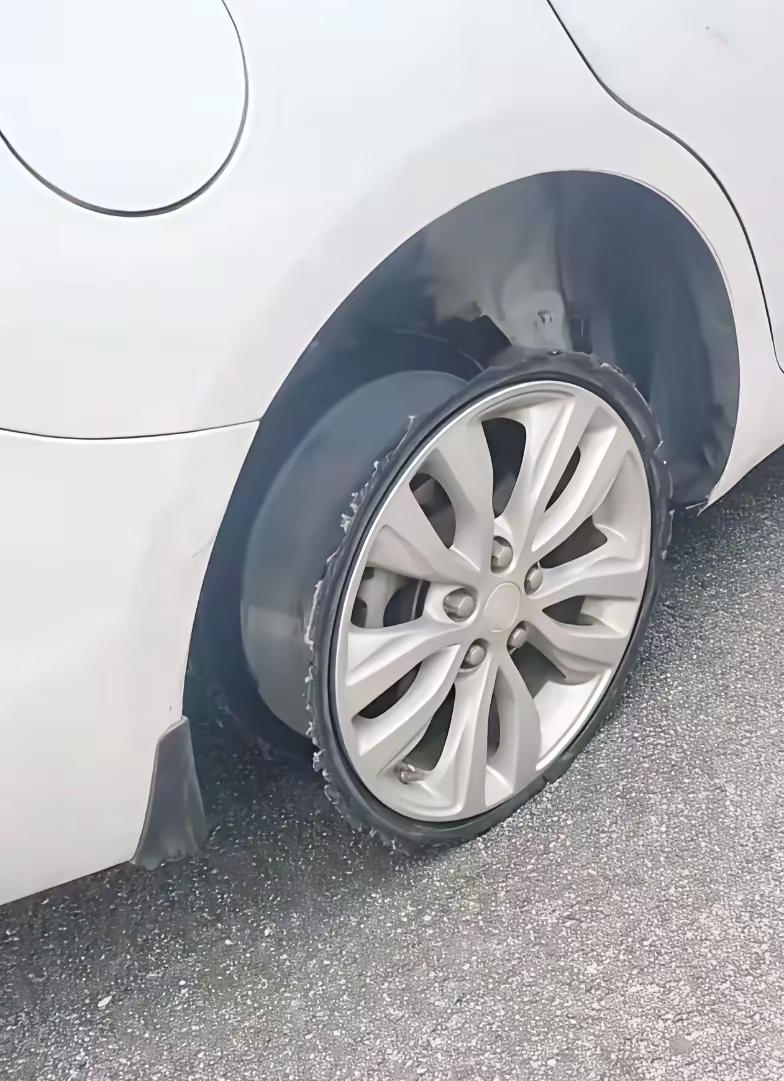 谁都没料到,根本不是漏气那么简单,右后轮轮胎早就直接脱落,车子全靠金属轮毂在地上硬磨前行。后方司机陈先生亲眼目睹全程,使劲闪灯、按喇叭提醒,付女士压根没发觉。