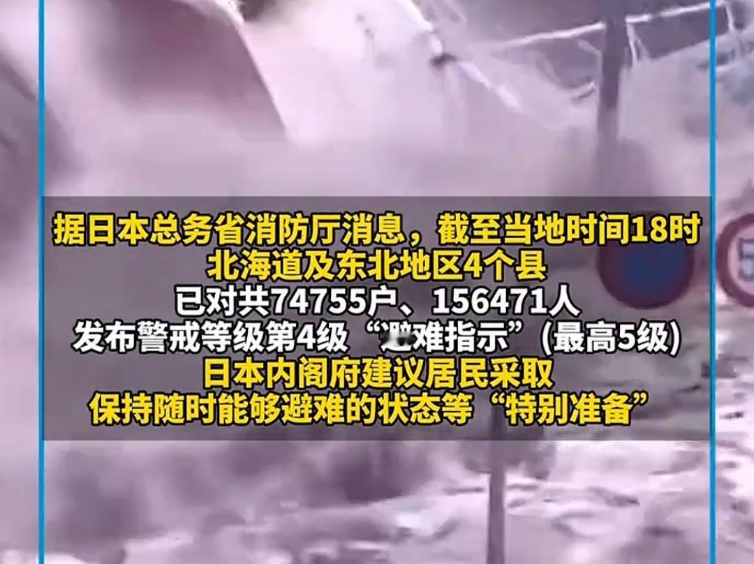 为预防出现更大的地震,截至当地时间4月20日18时,已对日本北海道及东北地区4个县,共计74755户、156471人发布警戒等级第4级“避难指示”,要求警戒区域的人员迅速转移出危险地点,前往指定避免场所或安全区域。该警戒等级,最高为5级。