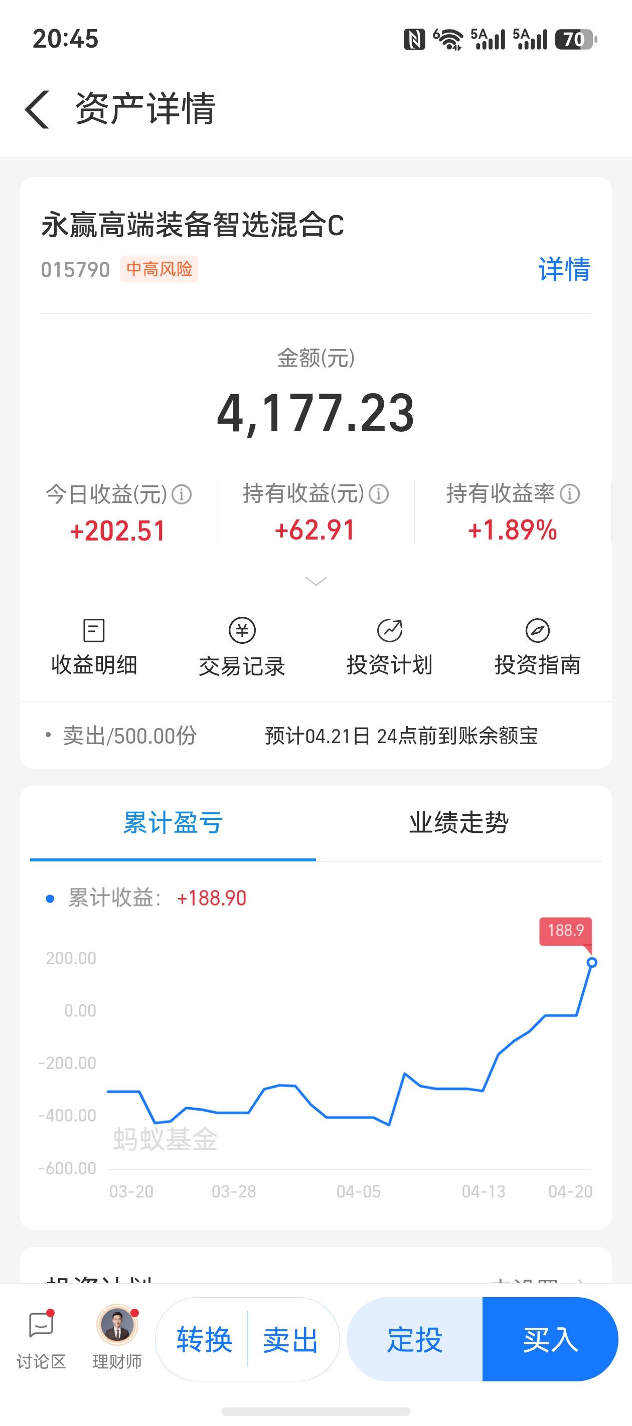今天航天板块大涨,持有的永赢高端装备终于盈利,上升通道已经打开,明天开始计划择机加仓。