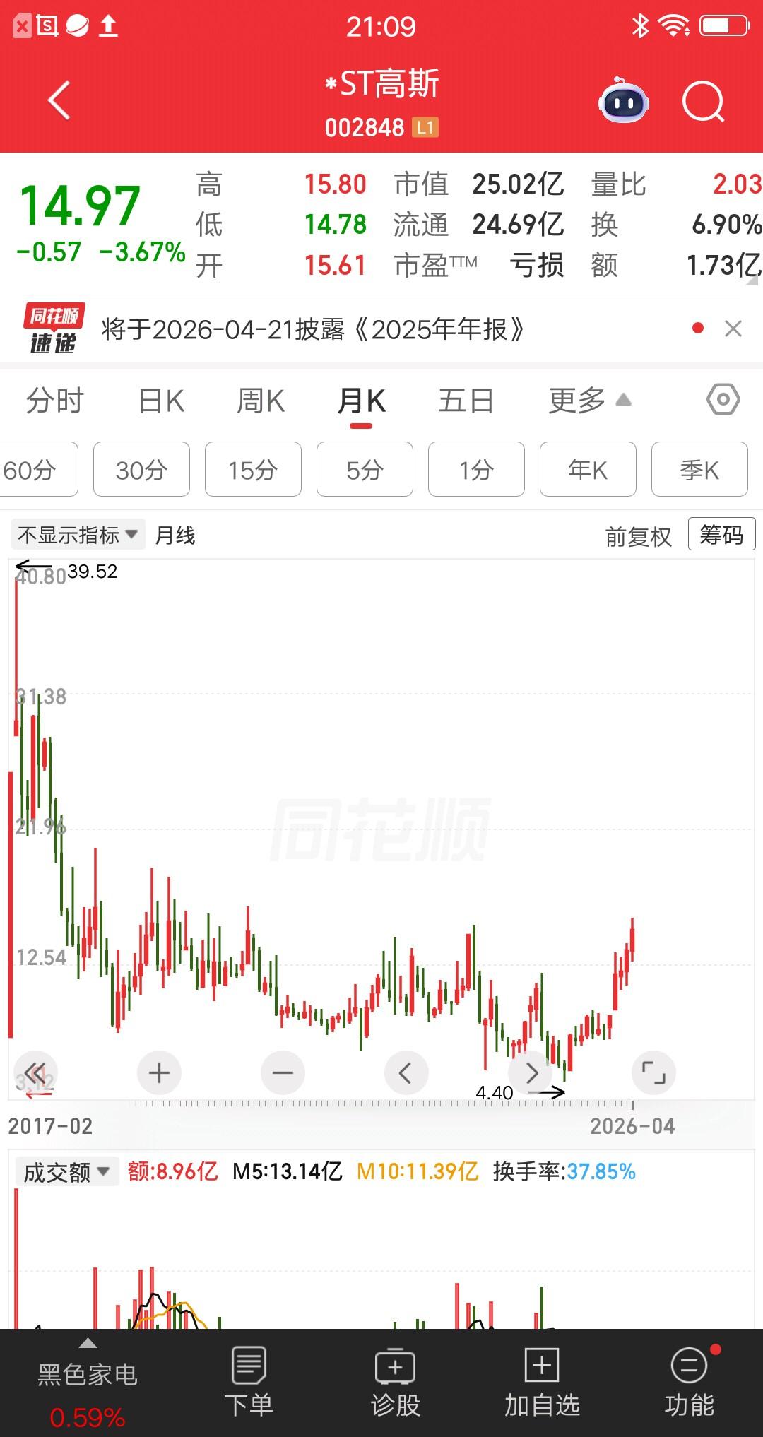后来股价再也没有回到31元,高斯贝尔在去年4月份,因业绩不达标被*ST。今天公司申请摘帽了,不出意外应该会成功。目前最新价15元左右,他浮亏超过50%。