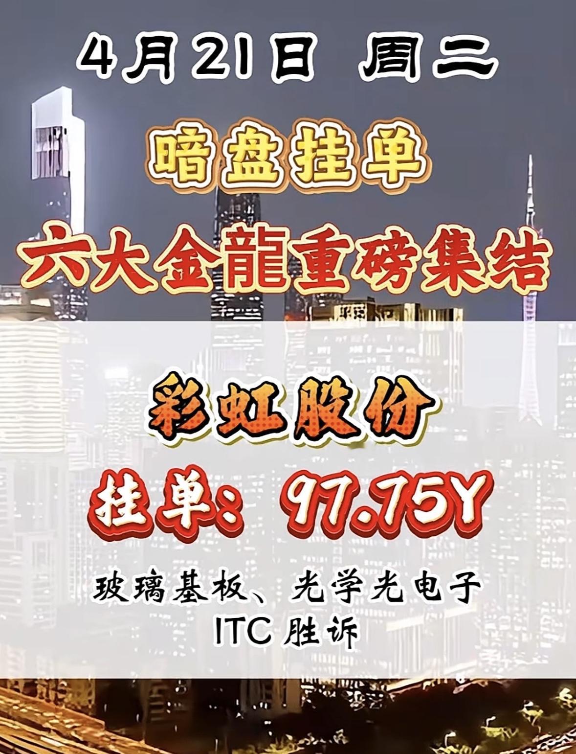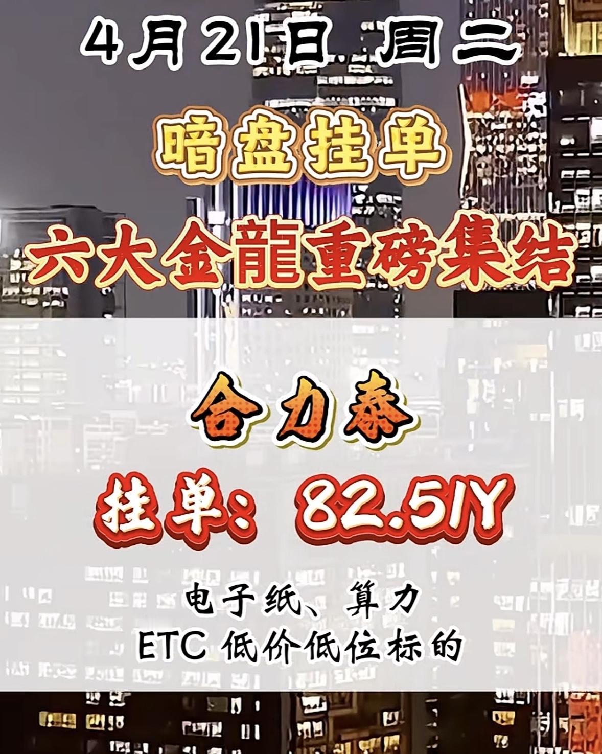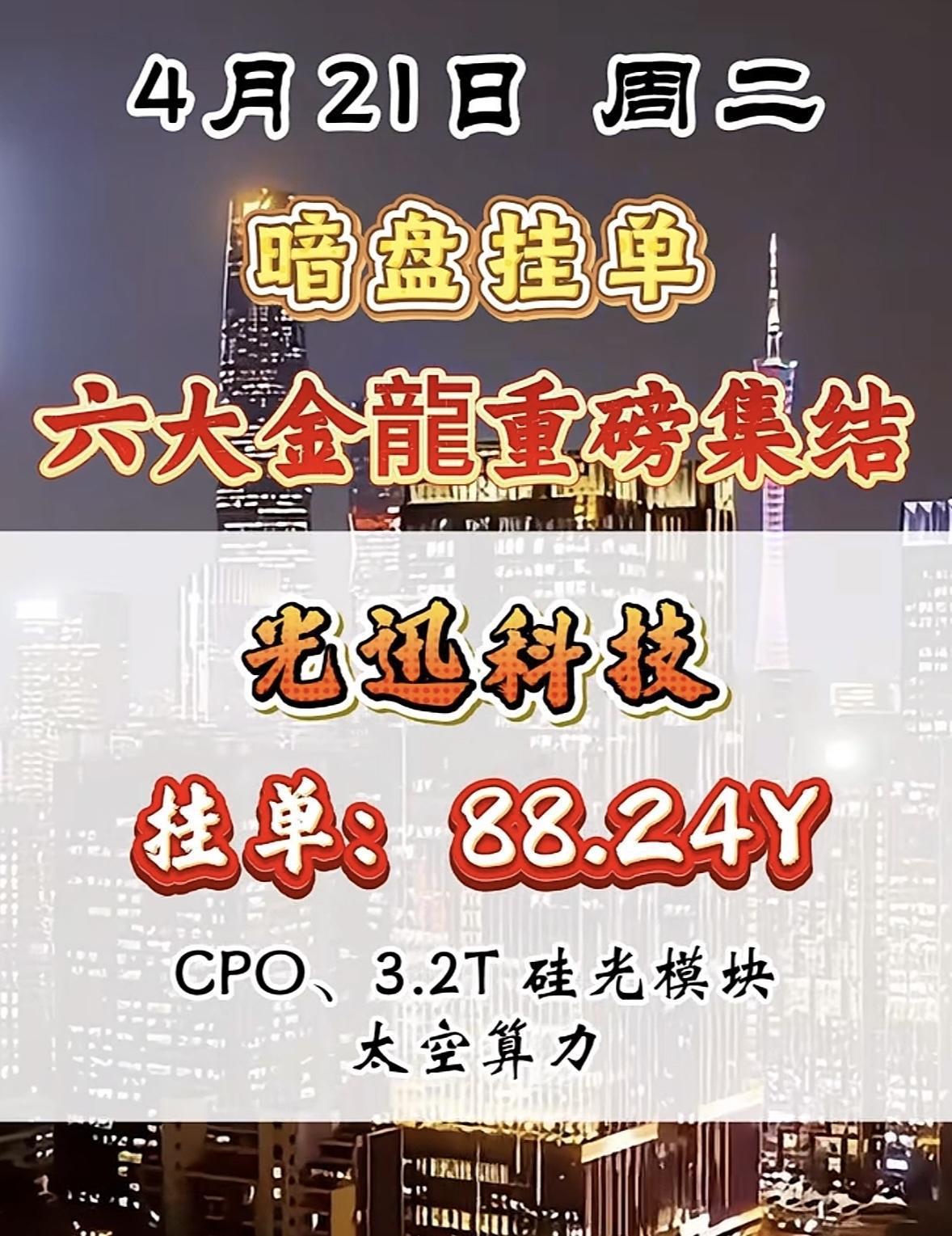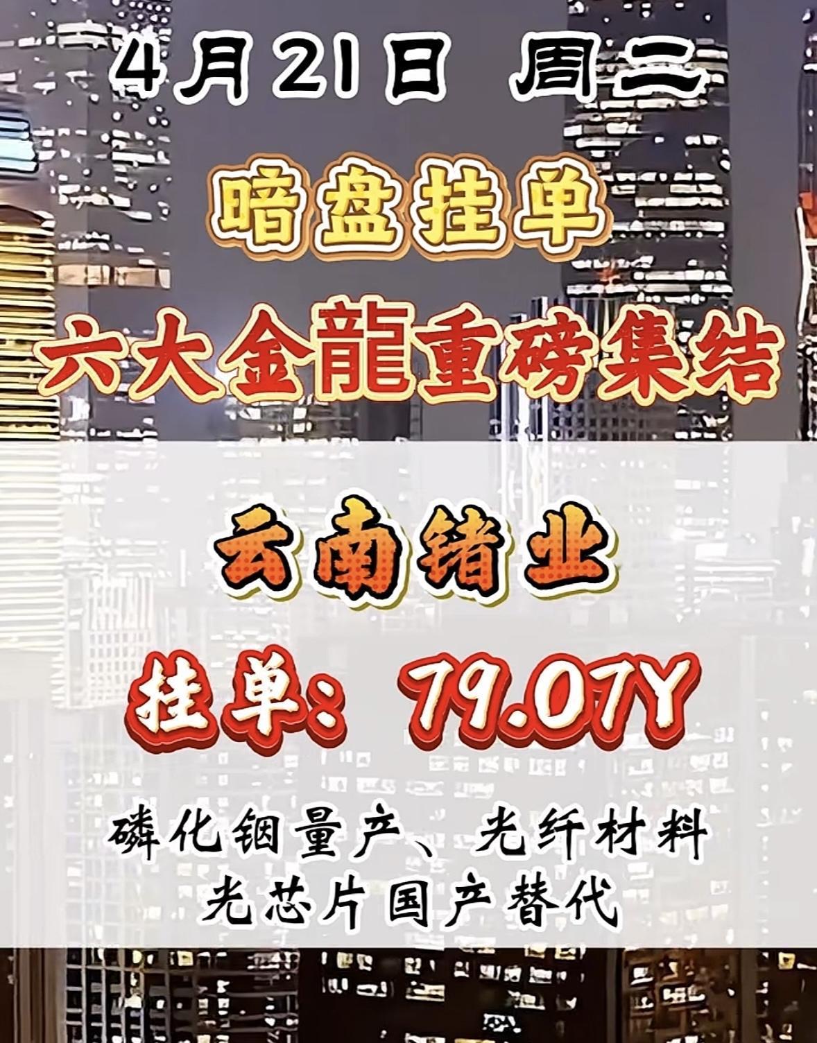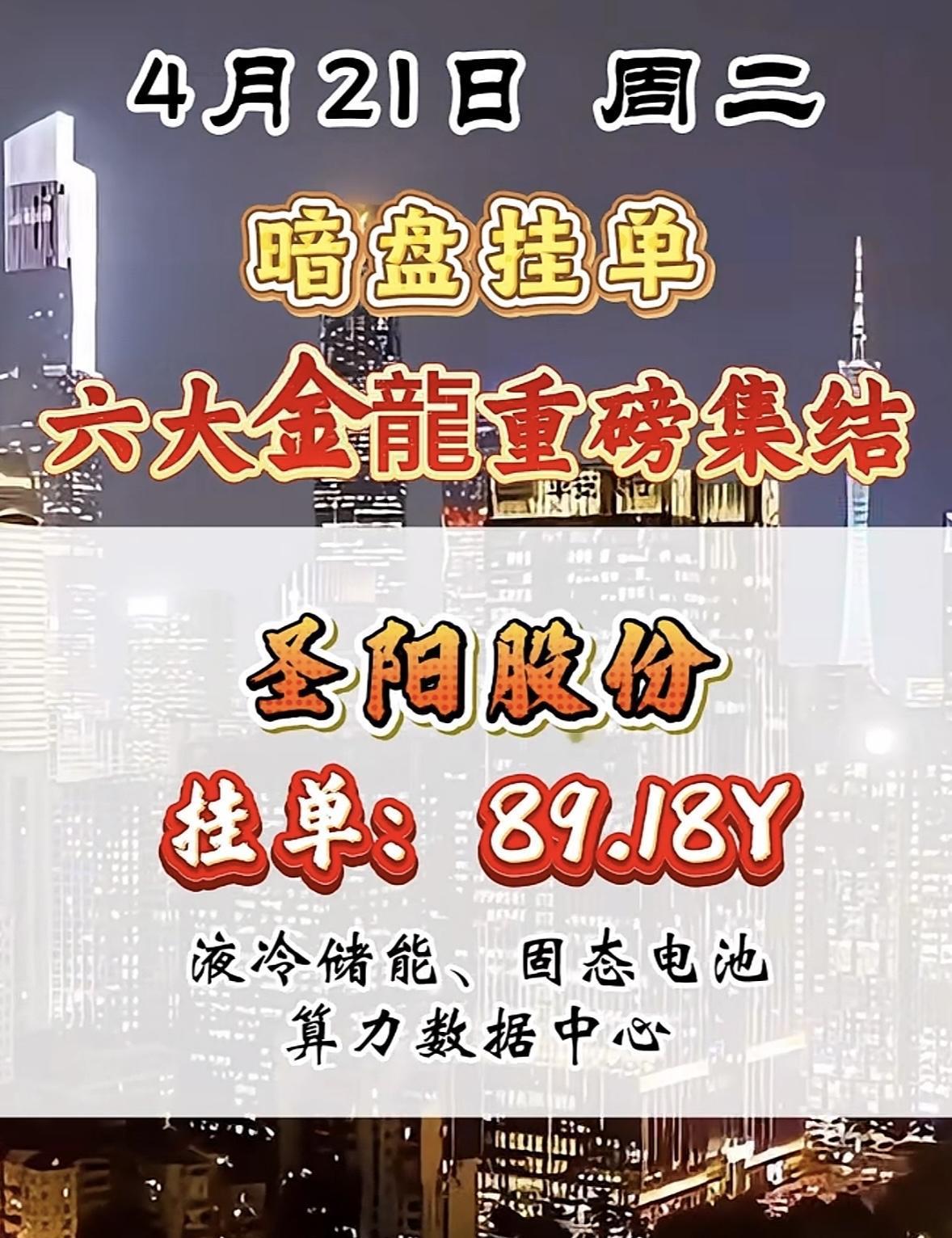 4月21日暗盘挂单,六大金龙要重磅集结,这可太让人期待了!看看之前4月14日和15日的暗盘隔夜挂单数据,变化还挺大。4月14日圣阳股份现价20.88,挂单52.08亿排第一,到了15日,现价涨到22.97,挂单50.63亿还是第一。博云新材也从14日的现价12.08、挂单48.60亿,变成15日的现价13.29、挂单47.94亿。不知道这次六大金龙会是哪些,又会带来怎样的行情,感觉有一场资本的好戏要上演了!