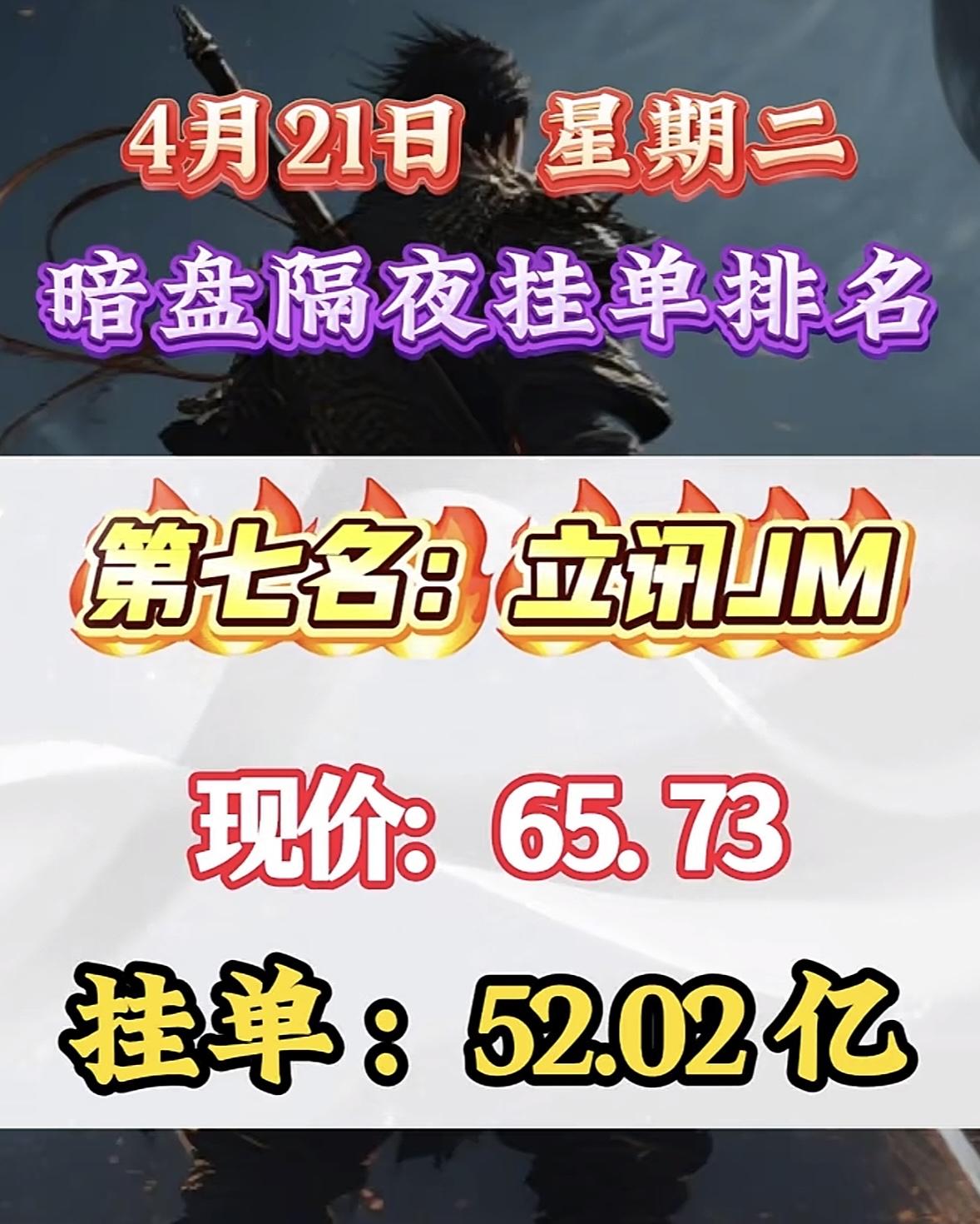 立讯精密在4月21日暗盘隔夜挂单排到了第七,这情况还挺引人关注的。现价65.73,挂单金额达到52.02亿,这数字可不小。这或许意味着市场对它有着较高的关注度和参与度。说不定有不少投资者都在盯着它,期待能从中获利。不过股市风云变幻,这么大的挂单金额,也不知道后续会怎么发展。是会一路上涨,让投资者赚得盆满钵满,还是会出现反转,给大家来个措手不及呢?只能拭目以待了。