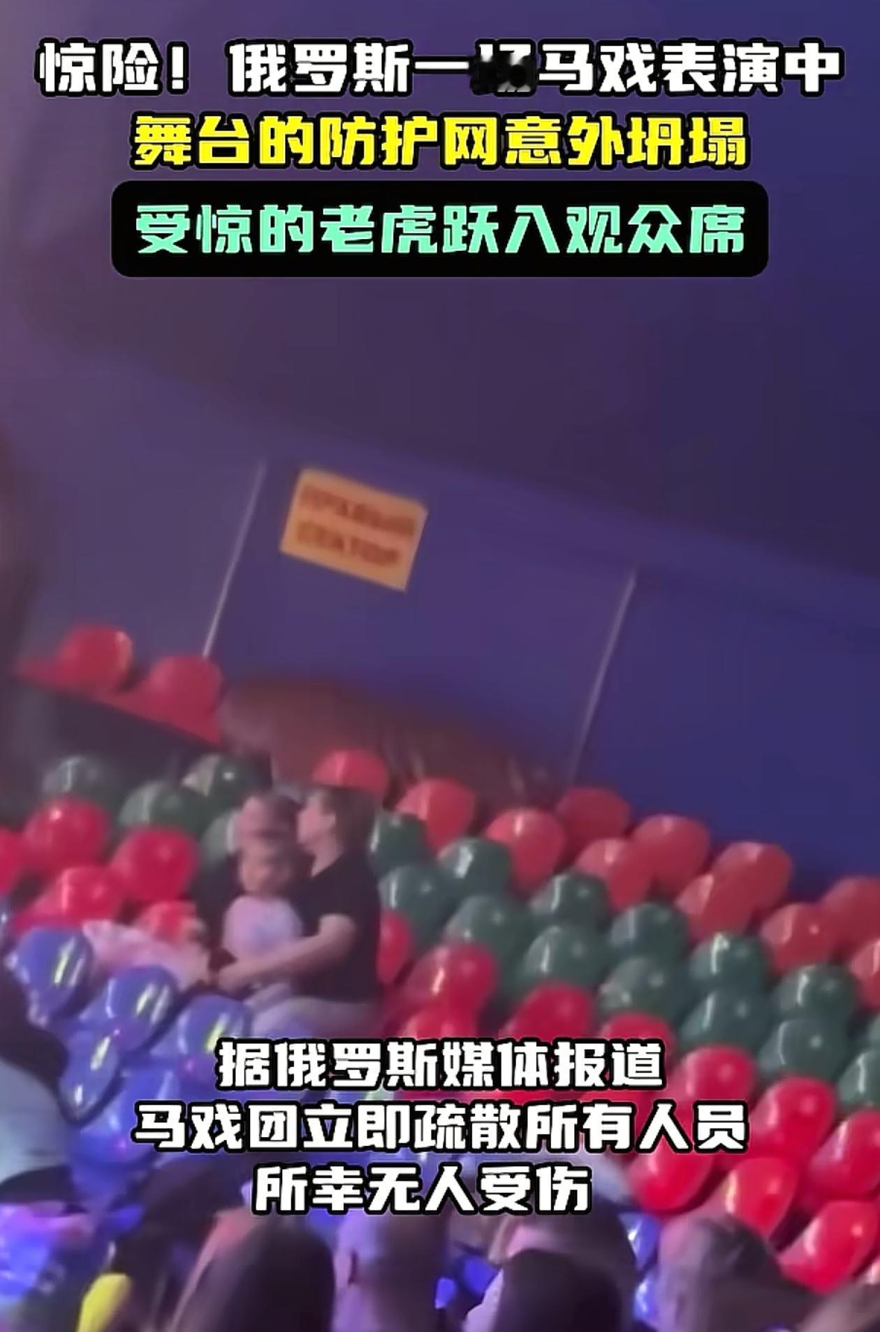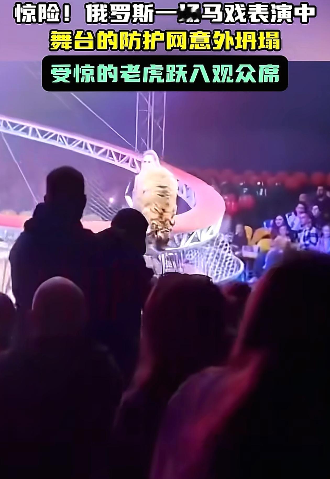 “太吓人了!”俄罗斯一马戏团正在表演的时候,用来隔绝动物和观众席的防护网突然掉了,恰好这时里面有2只老虎,其中一只唰地一下子就跳了出来。