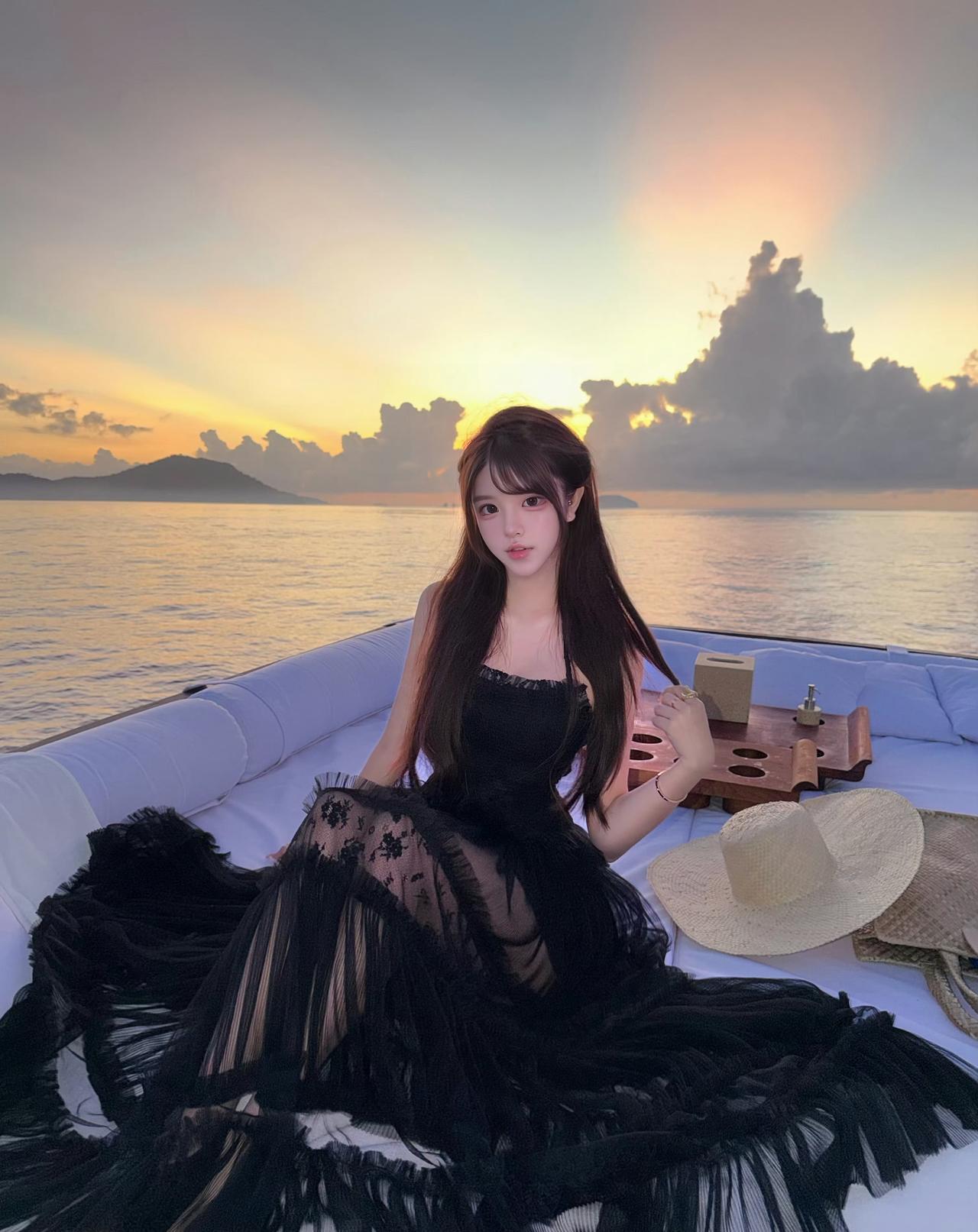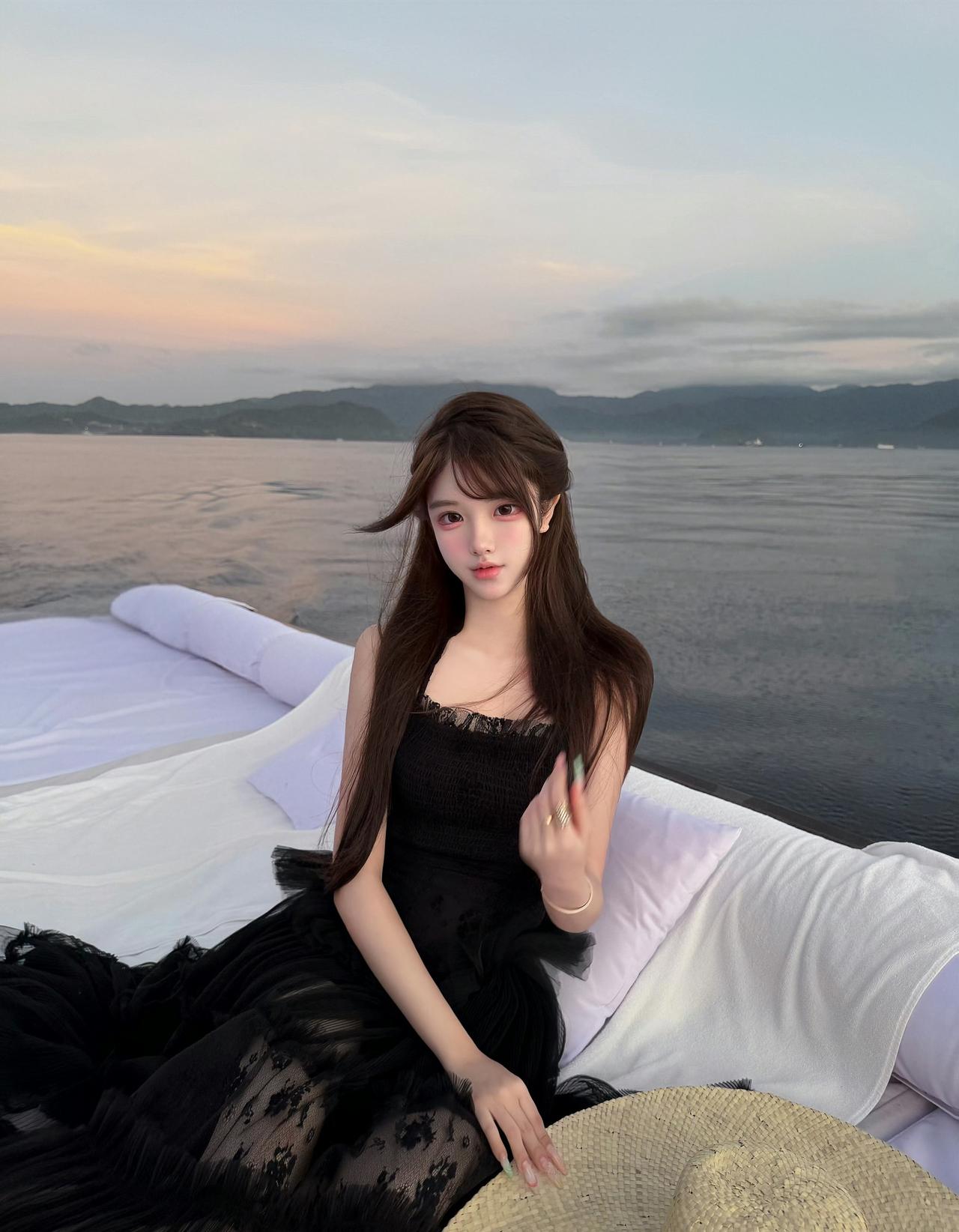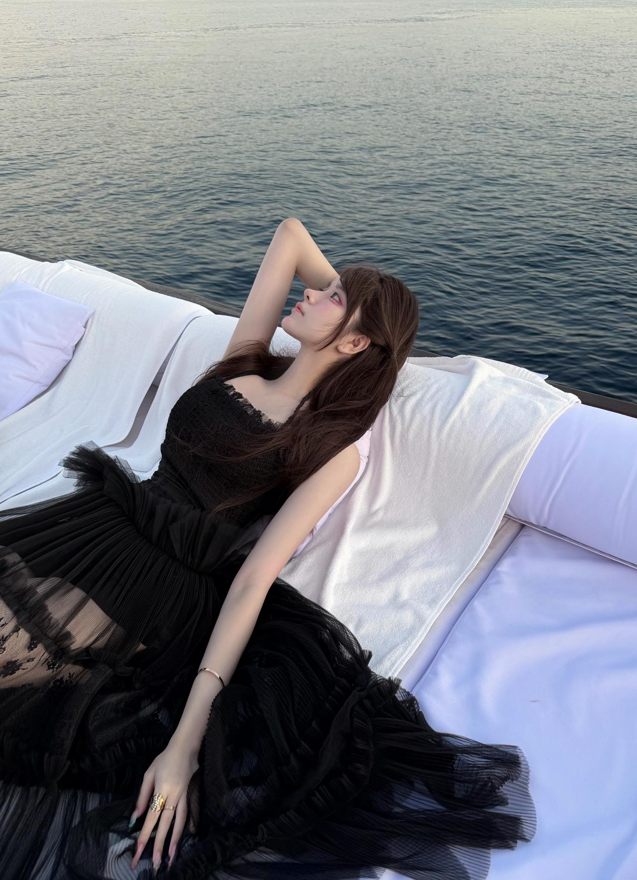 在日落时分赴一场海上约会,黑纱裙摆随晚风轻扬,把所有浪漫都藏进这片温柔暮色里。