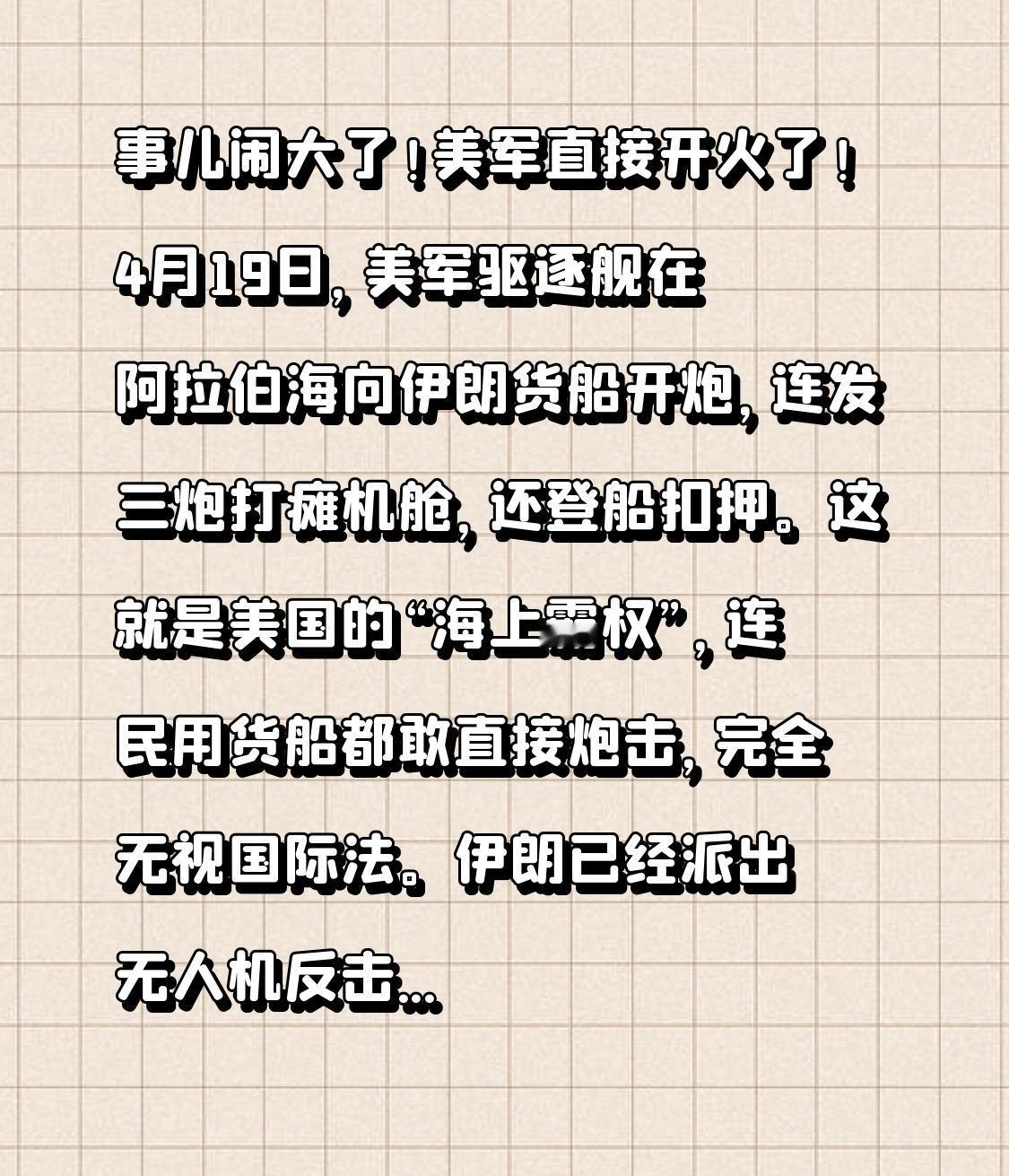 4月19日,美军驱逐舰在阿拉伯海向伊朗货船开炮,连发三炮打瘫机舱,还登船扣押。