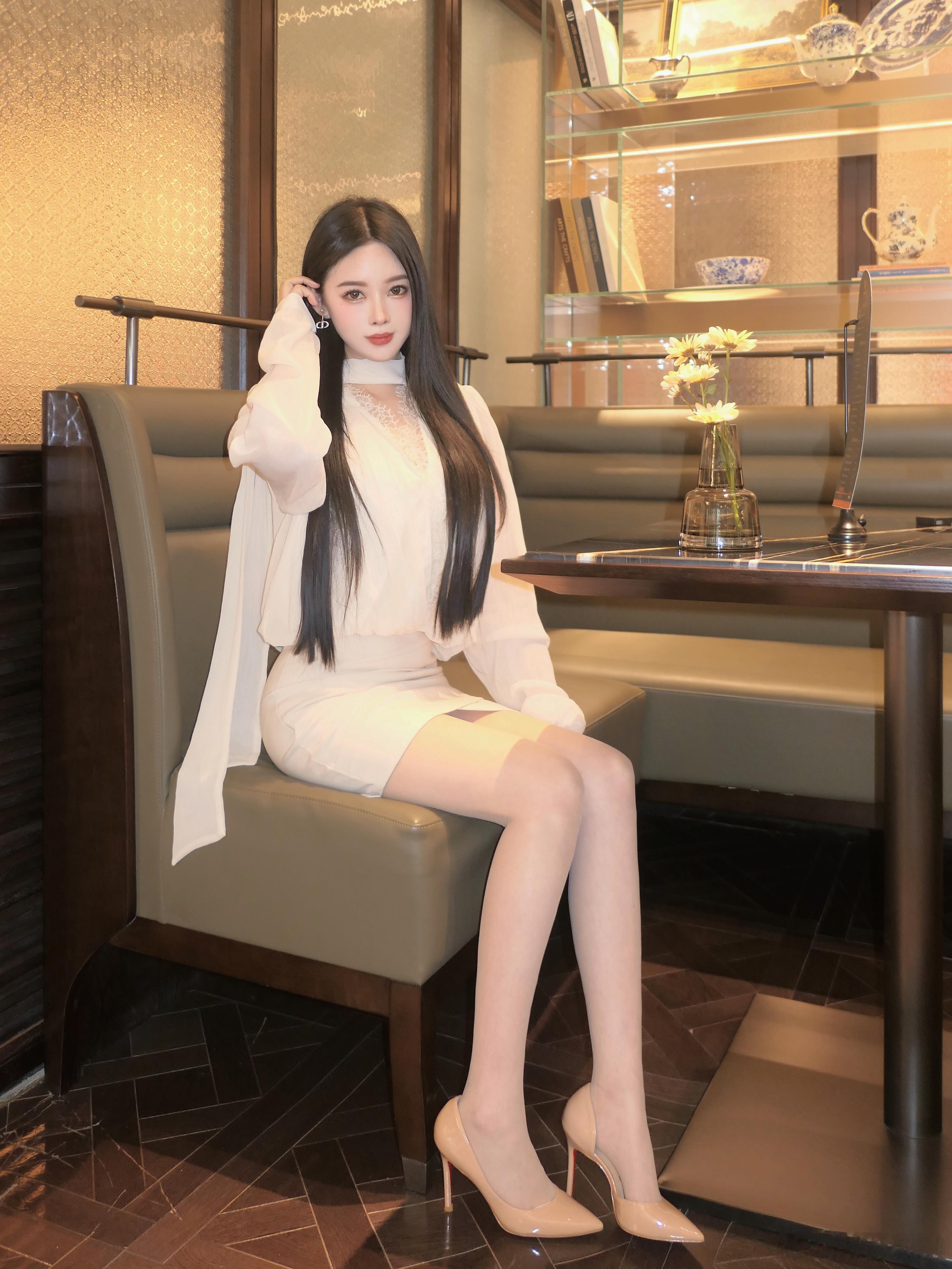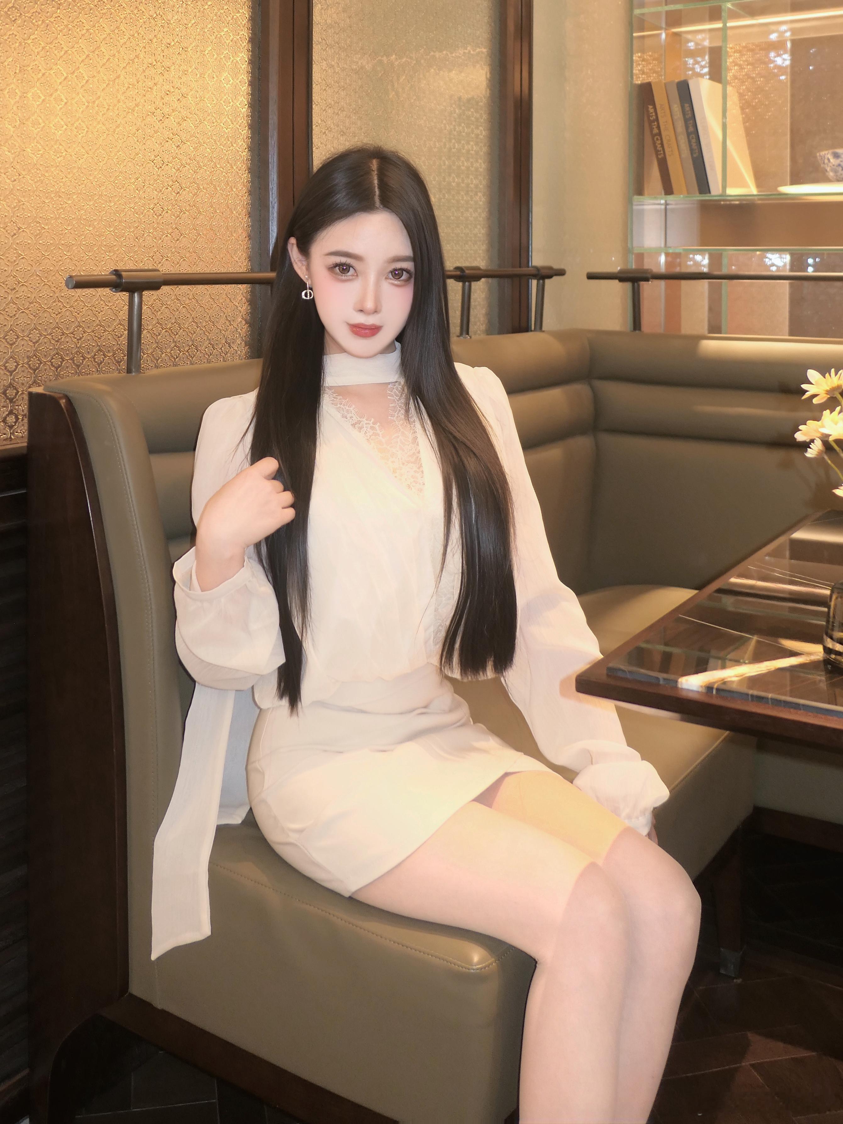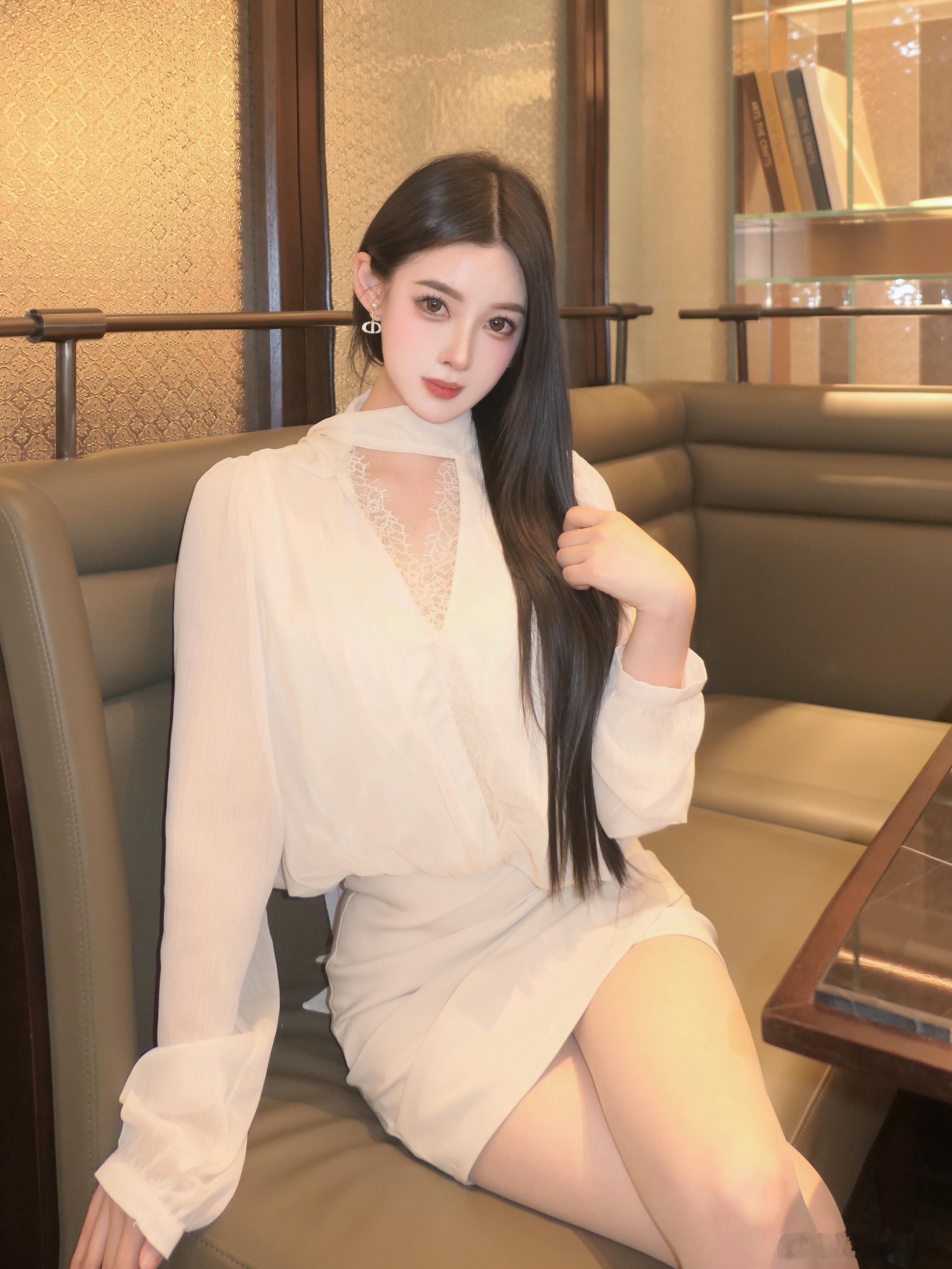 白裙似雪,金纹绣春山模样;蓝宝垂眸,坠成星子落柔裳。长发如瀑,梳开风的温