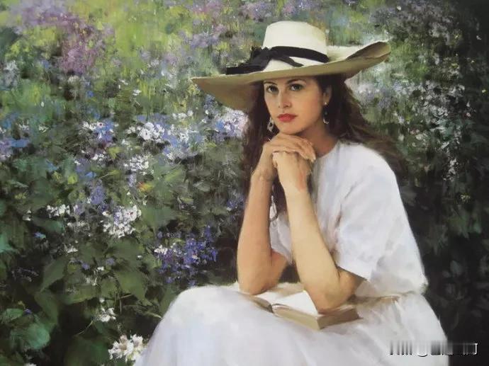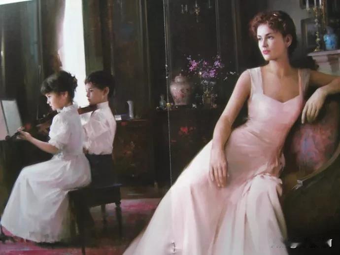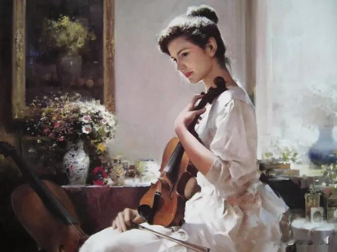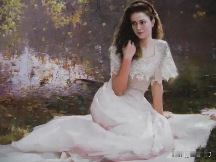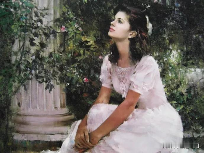 他的油画笔触潇洒娴熟,色彩细腻柔和,擅长营造朦胧光影与戏剧化氛围。笔下女性神态宁静优雅,兼具西方古典气质与东方含蓄神韵,展现出写实功底与写意美感。