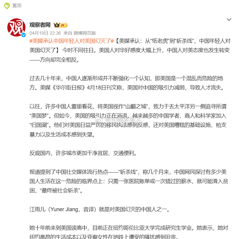 美媒承认中国年轻人对美国幻灭了 美媒可以去采访对美国神话仍有想像的中国中老年人,或者中国公知呀