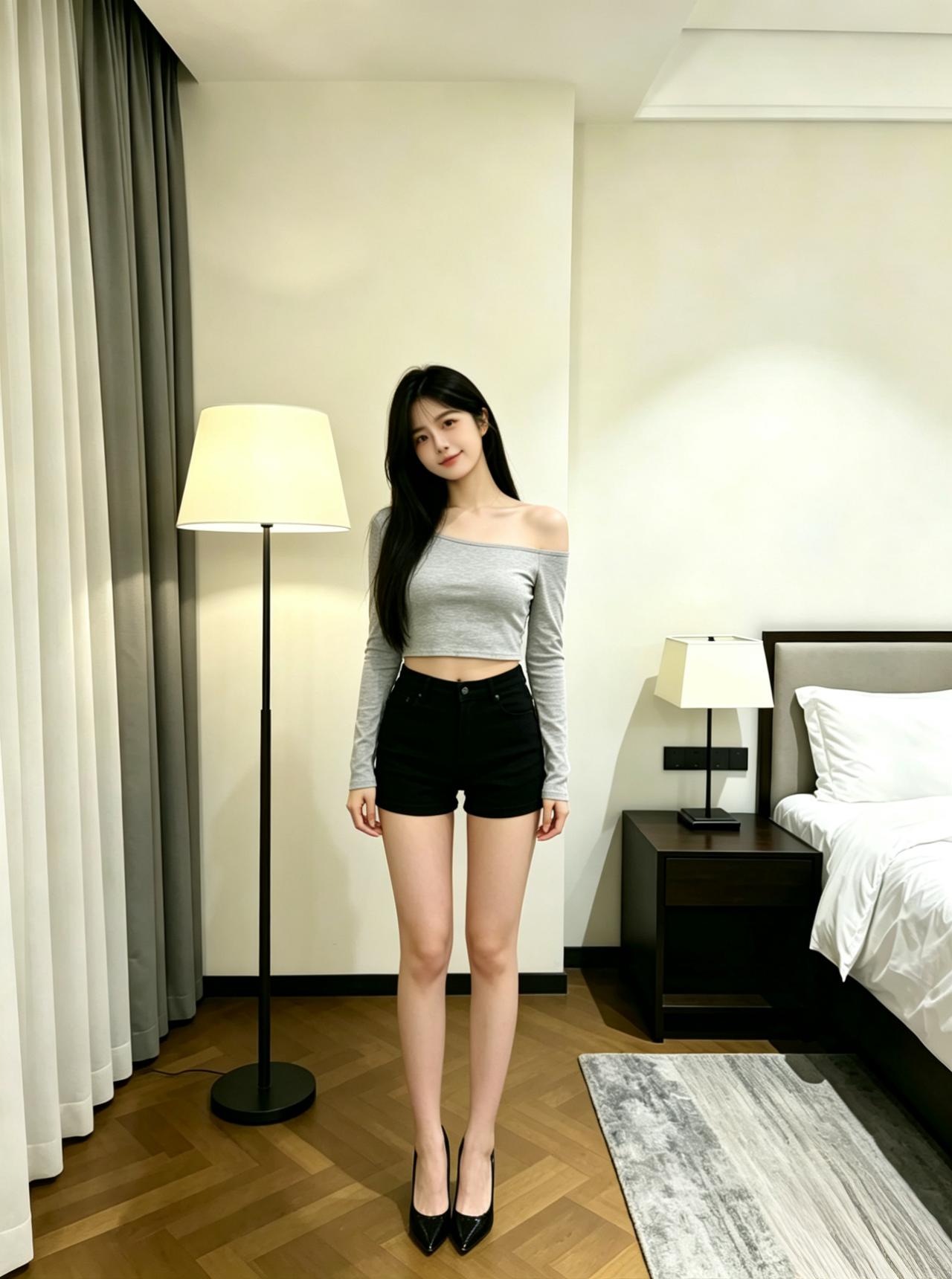 什么才是一个女人的魅力? 身穿灰色系的短款露肩长袖上衣, 下装搭配黑色高腰热裤,