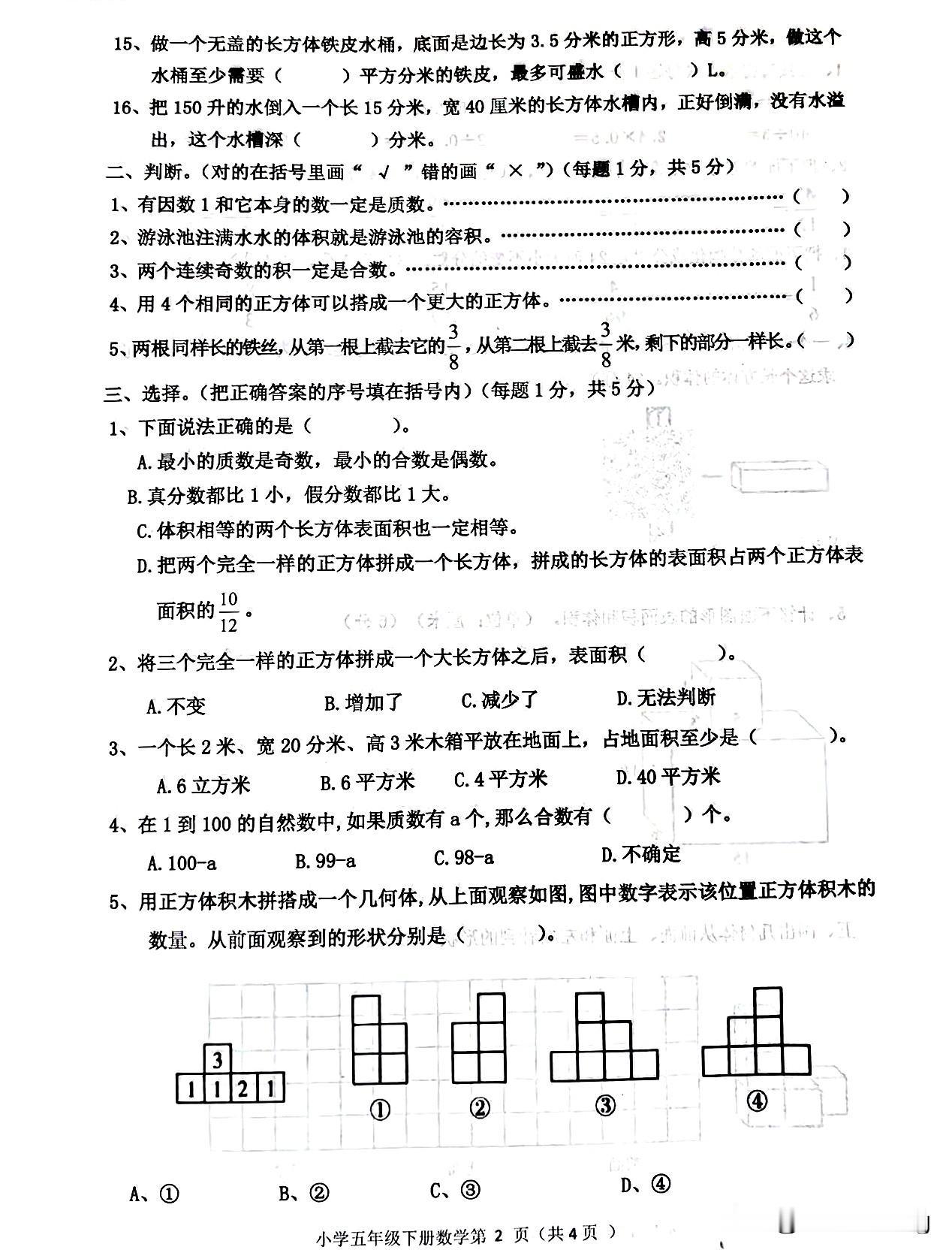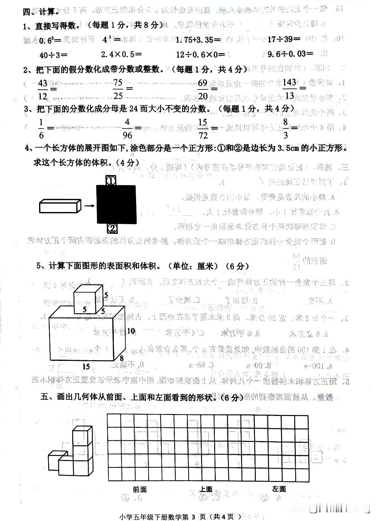 五下数学阶段练习(内容:观察物体~分数的基本性质),提升孩子解题能力!📚💡