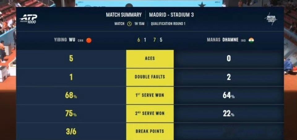 🟠ATP1000马德里男单资格赛首轮✅🇨🇳吴易昺6-1/7-5击败🇮🇳达姆尼跻身资格赛决胜轮