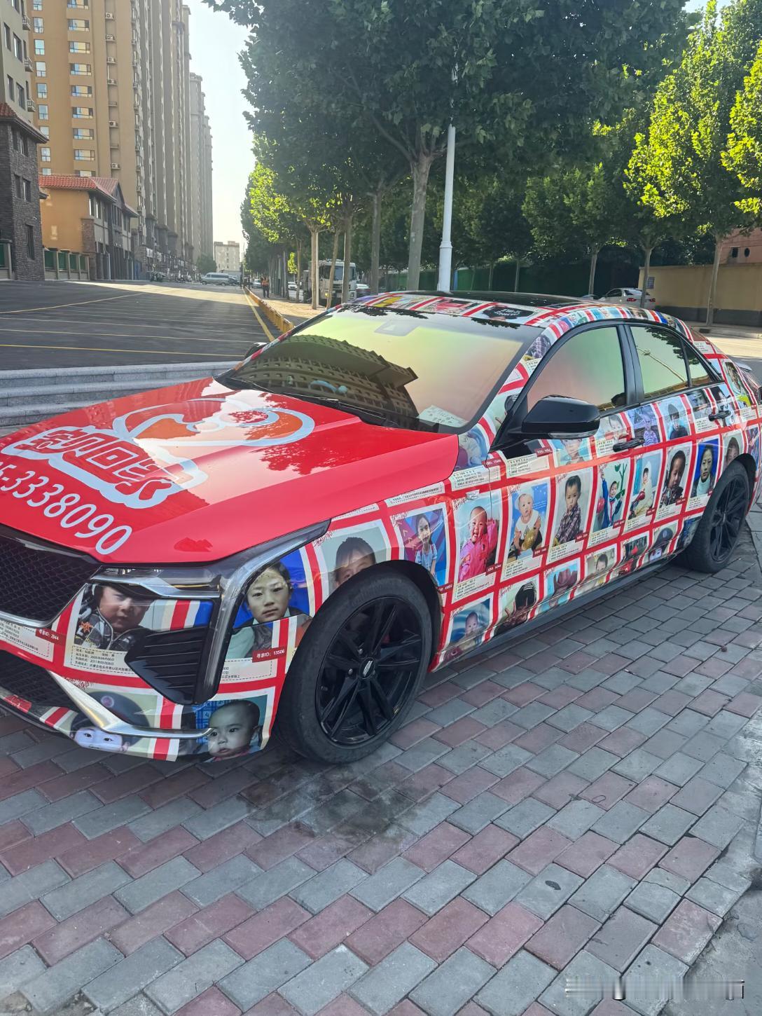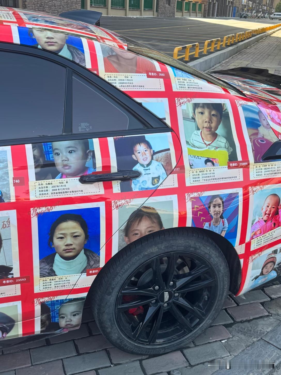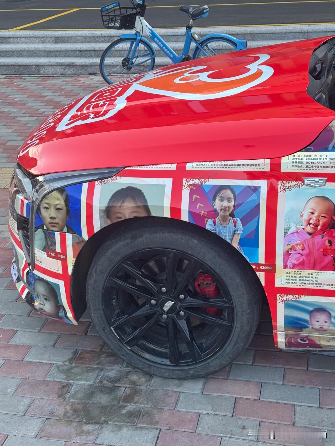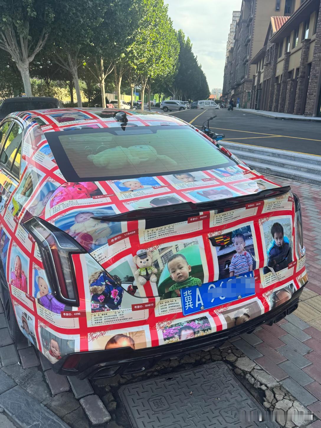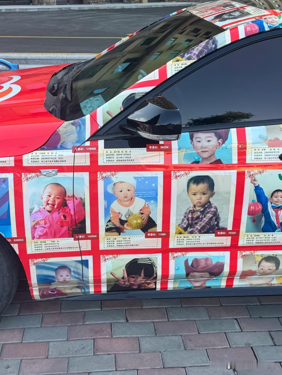 当我们谈论汽车贴膜,大多时候聊的是哑光黑的酷、渐变色的潮、透明车衣的保护。可眼前这台凯迪拉克,却打破了所有关于“车膜美学”的常规定义——它的每一寸车漆,都被一张张寻子启事铺满。红底白框里,是一个个孩子稚嫩的脸庞,下方印着编号、信息和联系电话,像一张流动的“希望地图”,在城市的街巷里无声奔走。
