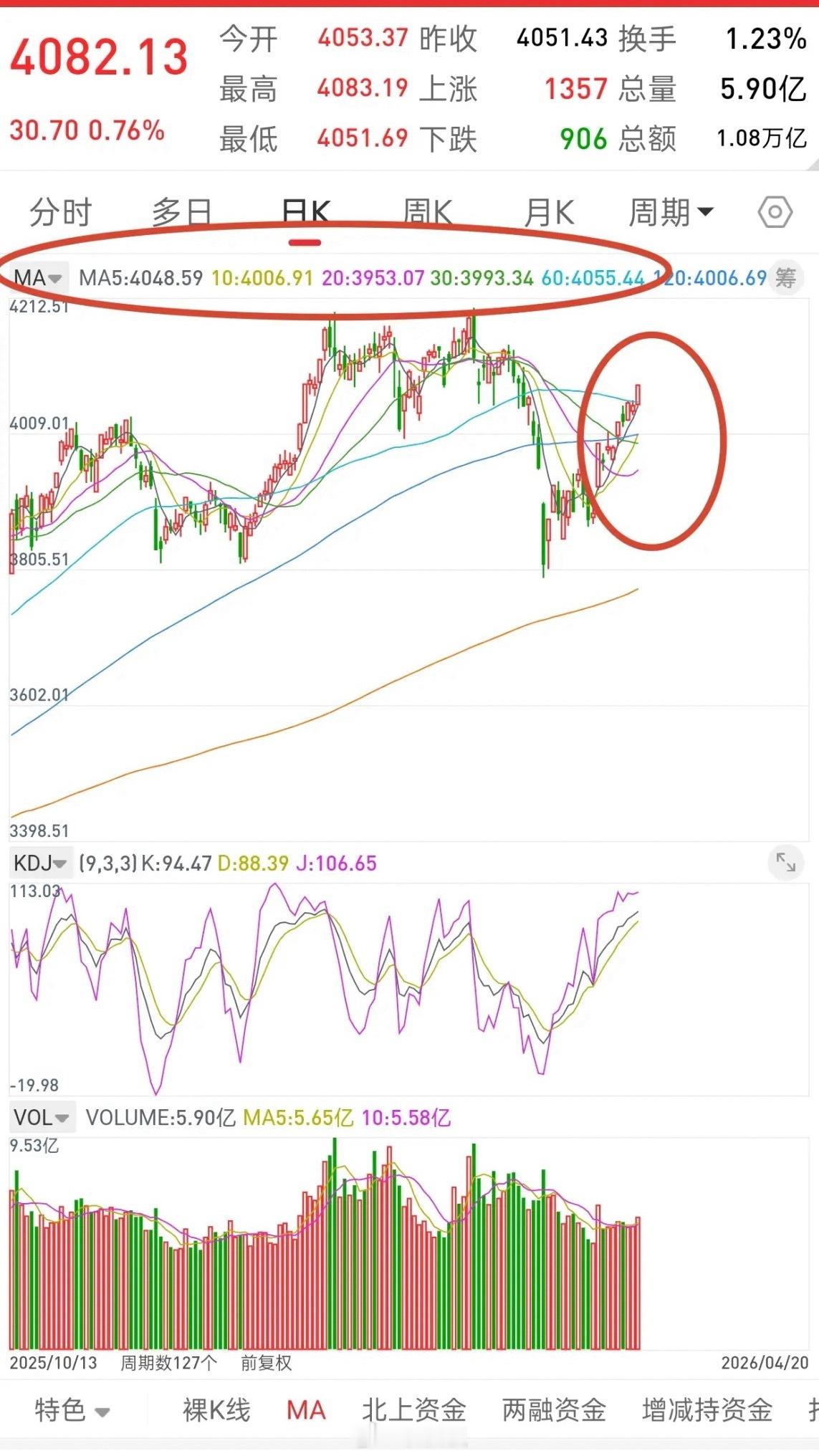 目前均线,5-10-20-30日均线分别是4048,4006,3950,3993等。