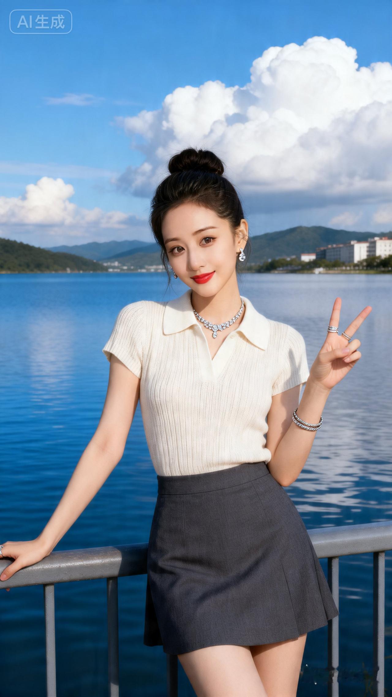 少女心爆棚的湖畔自拍,清新甜美,比个V字笑靥如花!🌸💖📸