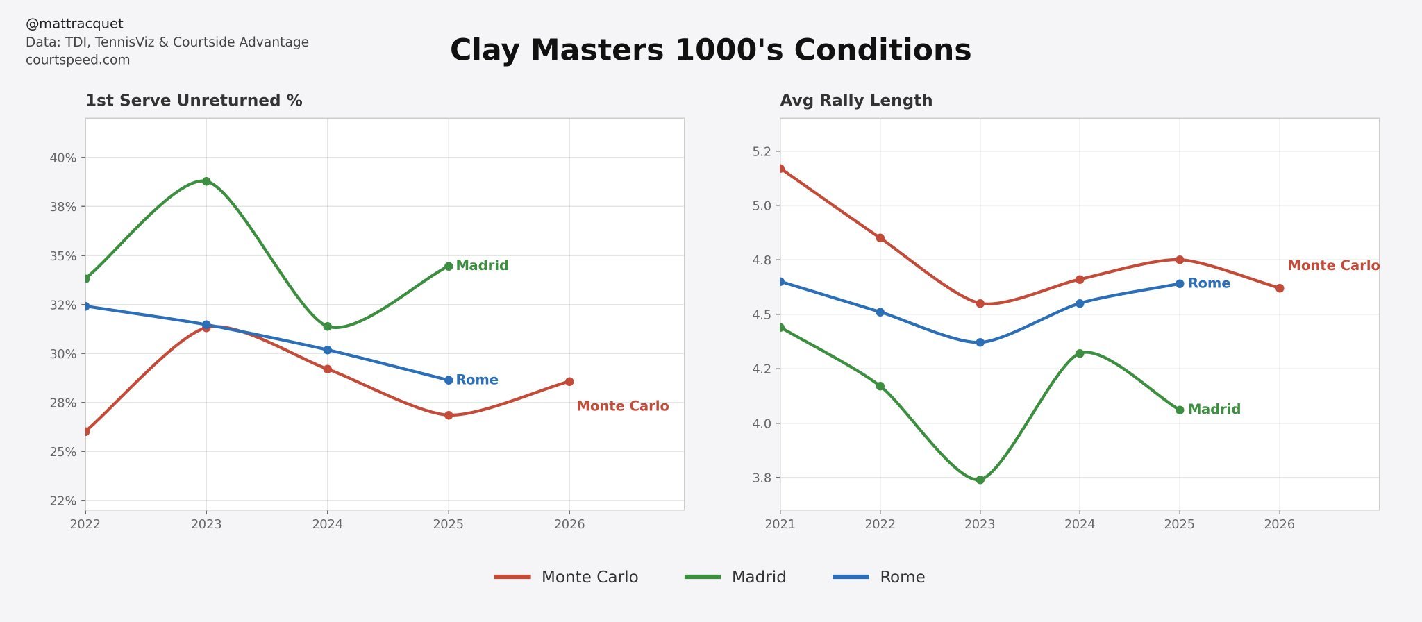 两位世界第一辛纳和萨巴伦卡,都抵达马德里开始训练。辛纳的预计对阵:8强德米纳尔,半决赛穆塞蒂,决赛兹维列夫;萨巴:八强保利尼,半决赛斯瓦泰克,决赛莱巴金娜。马德里海拔在650-670米之间,球速在三大红土大师赛中最快,体现在比赛中就是更高的发球直得率和更低的多拍回合图三。马德里大师赛整体的环境,对发球好球速快的球员更有利,红土上的上旋球在高海拔的稀薄空气中,威力会有所减弱。
