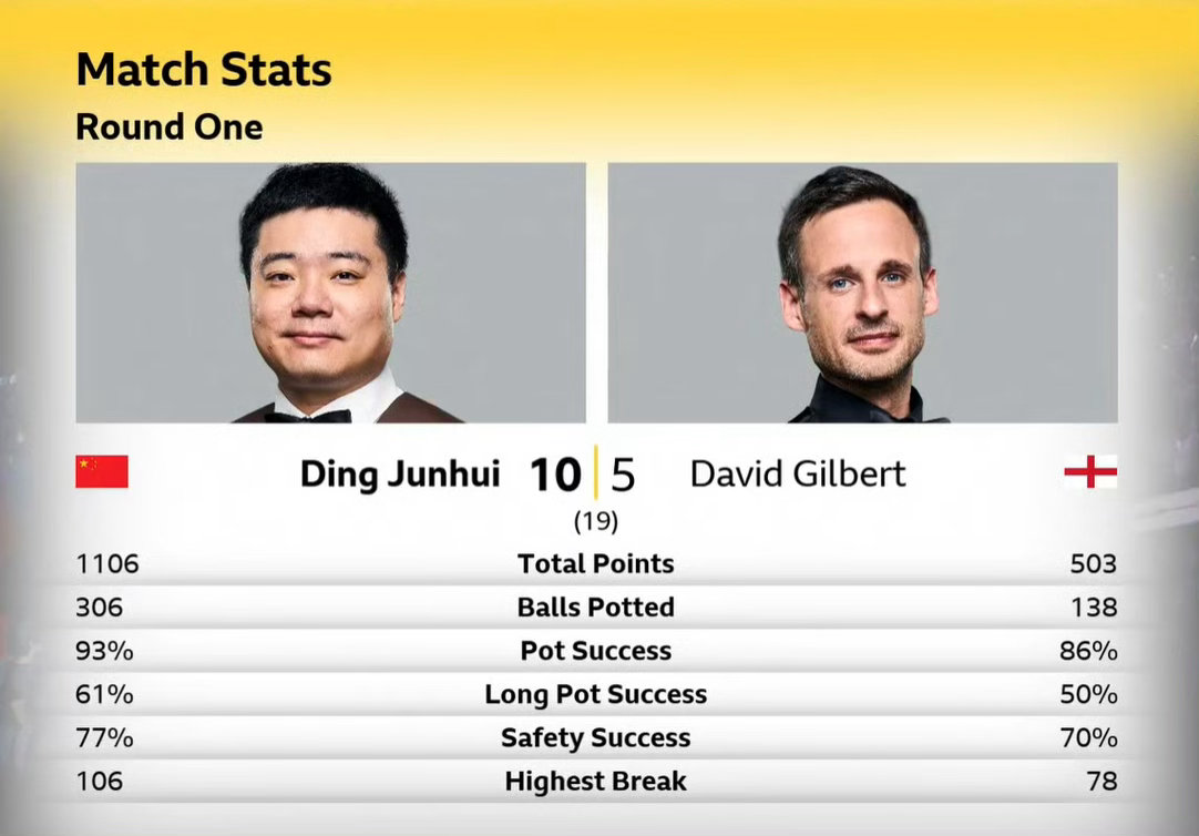 全场数据亮眼,丁俊晖先后轰出106分、100分两记单杆破百,外加7杆50+高分连续得分,进攻效率与控球手感双双在线;反观吉尔伯特仅打出3杆50+,始终难以突破丁俊晖的防守布局,无力扭转战局。