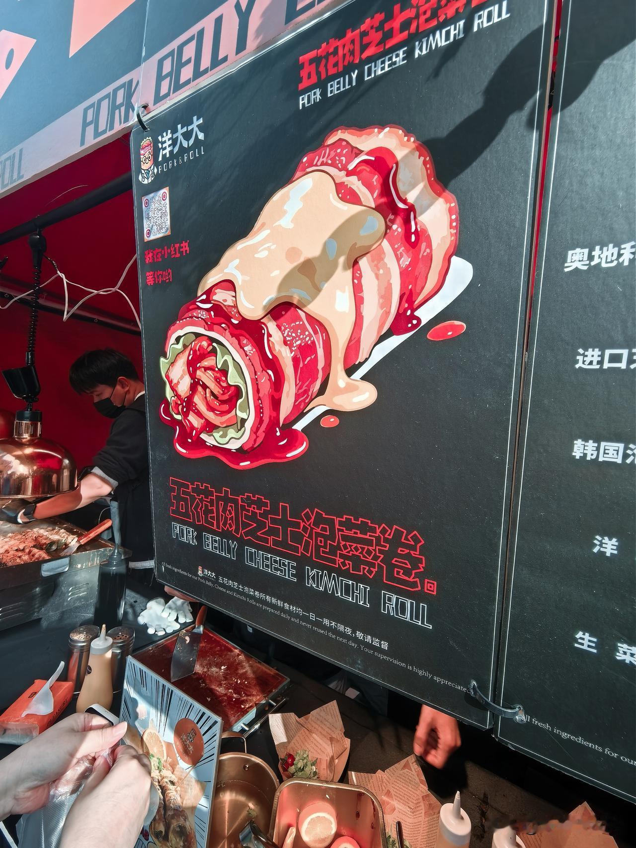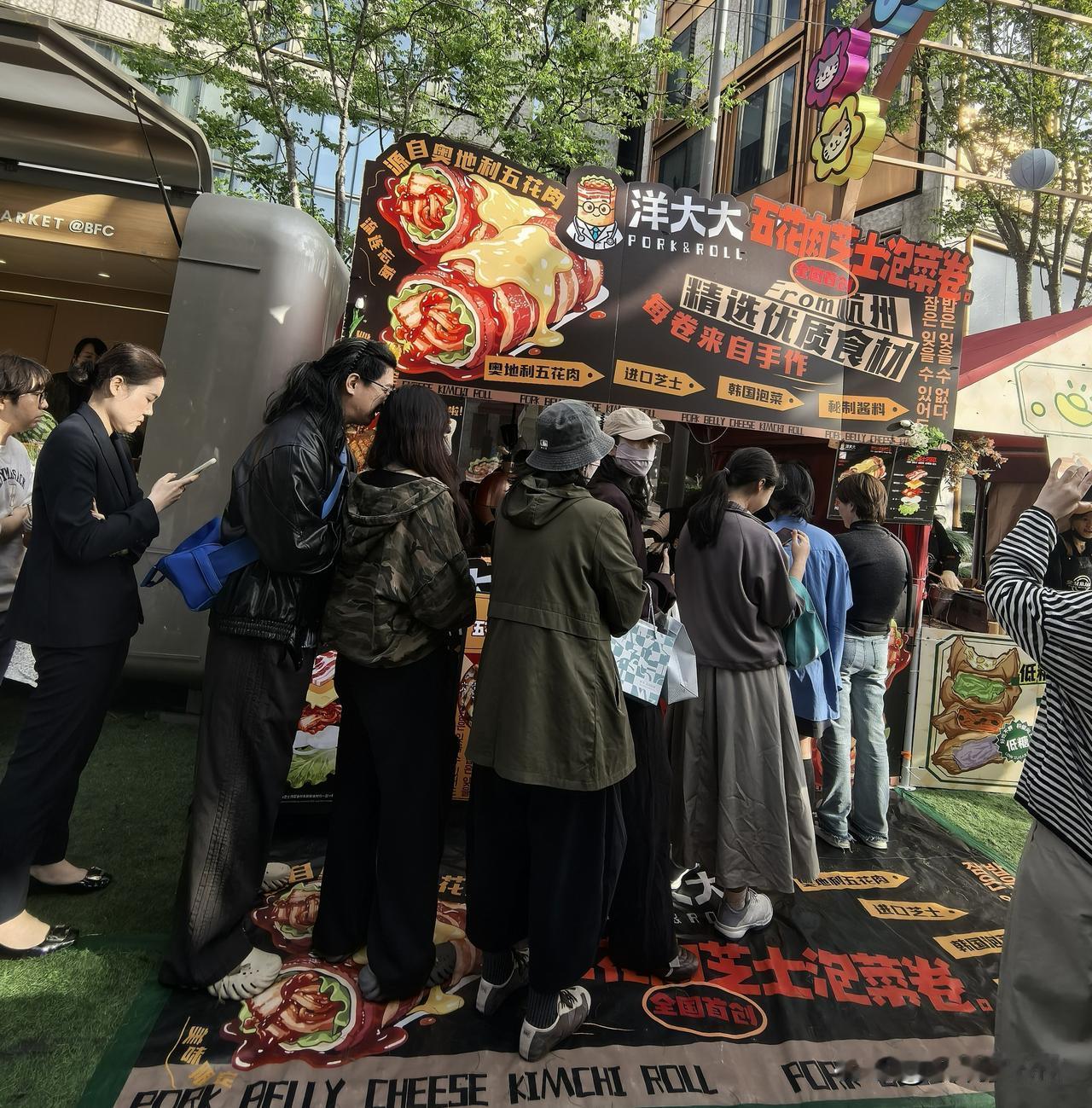 五花肉芝士泡菜卷摊前的长队诠释着“销售旺”。