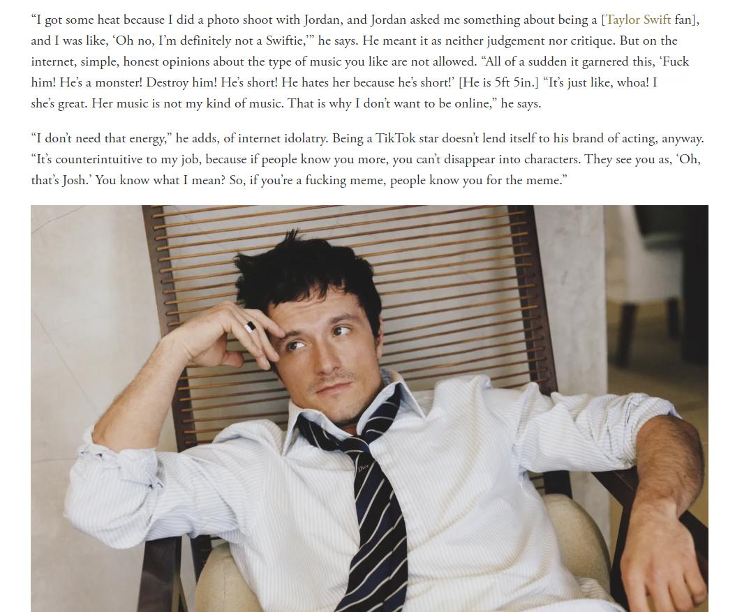 《玩具熊的五夜惊魂》、《饥饿游戏》乔什·哈切森(Josh Hutcherson)接受《GQ》杂志采访,回应之前因为说“我不是霉粉(definitely not a Swiftie)”而被网暴的经历: