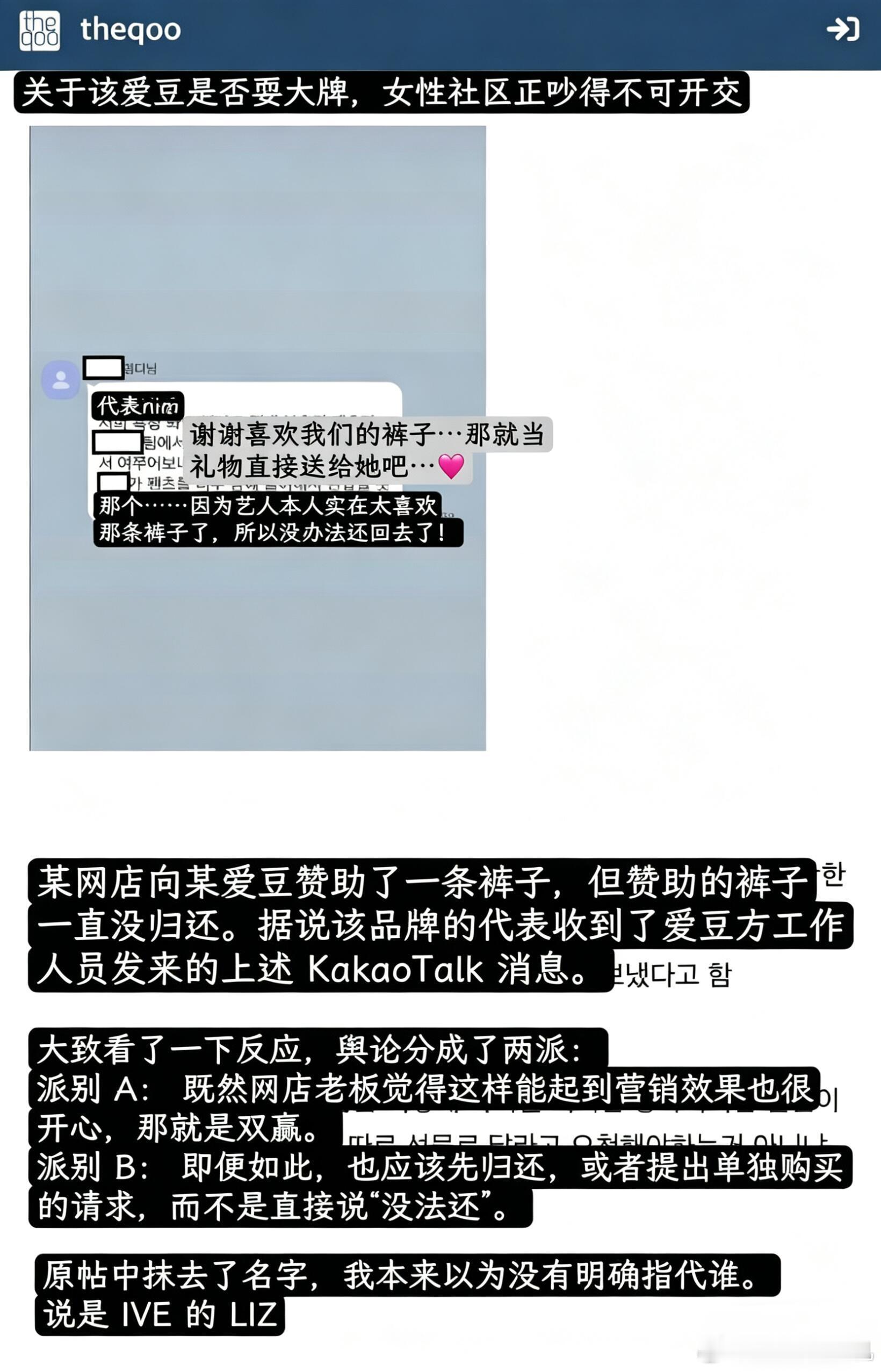有人发帖称LIZ没有归还赞助的裤子