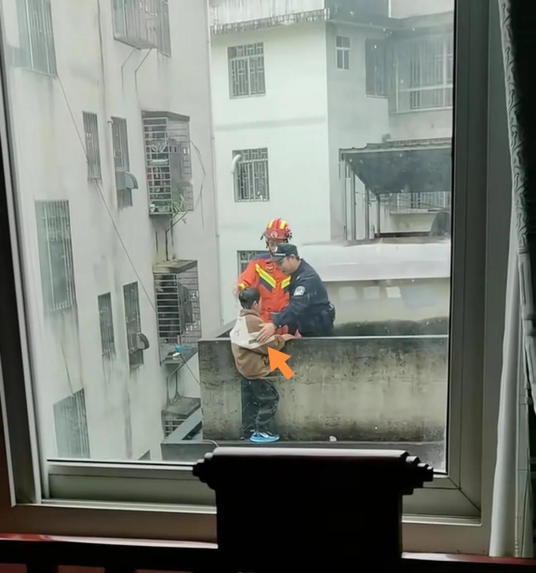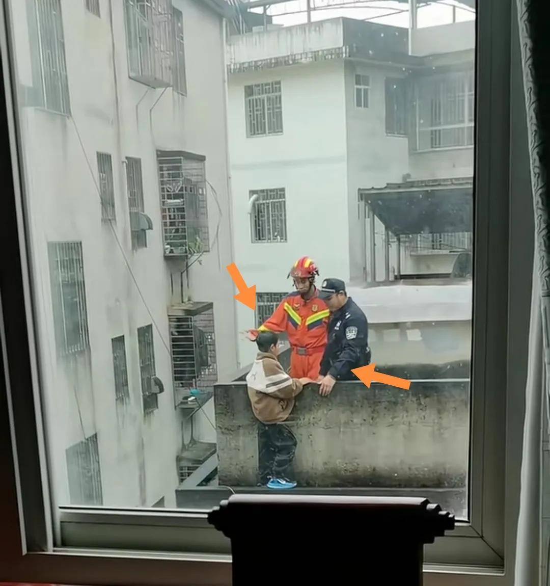 一小学生站在楼顶外边沿欲跳楼被消防员和警察谈心后获救。