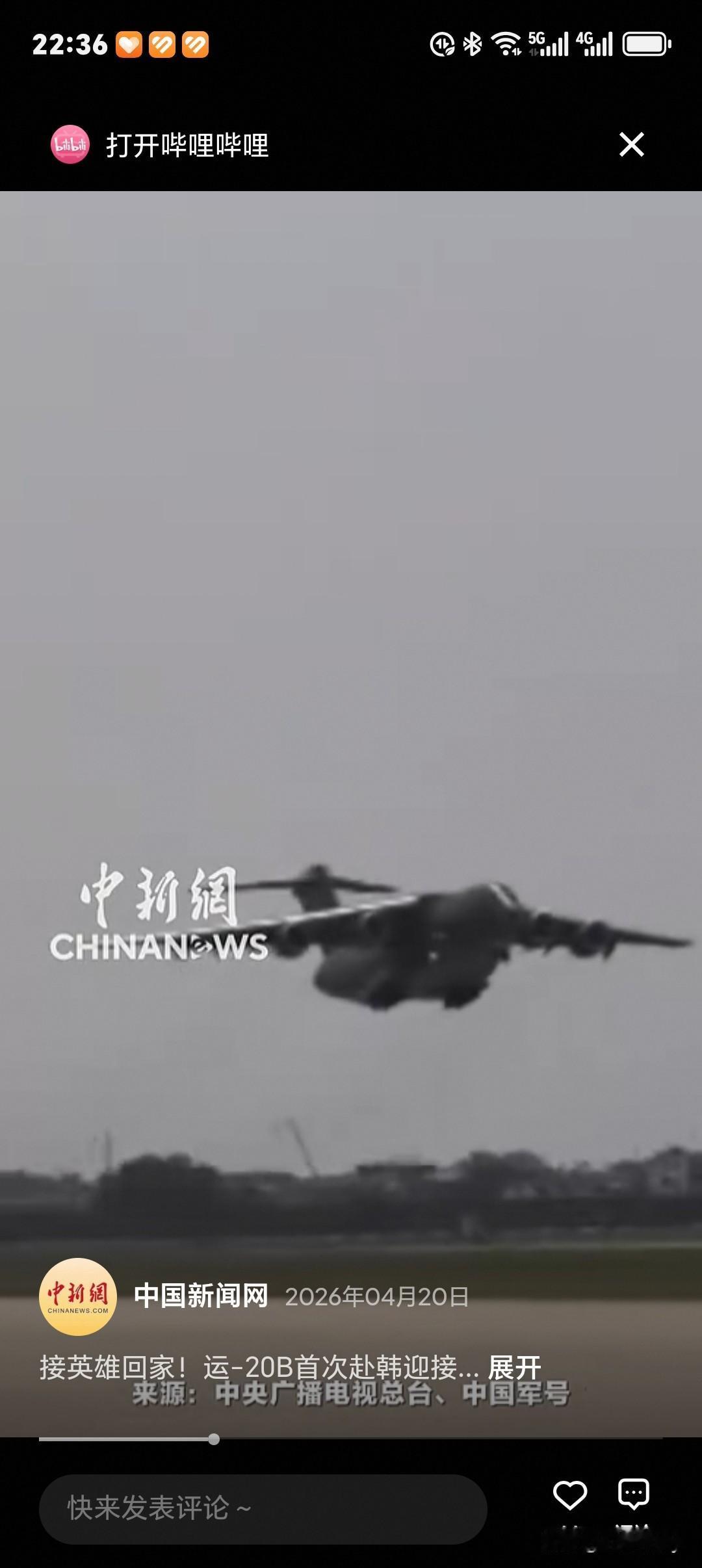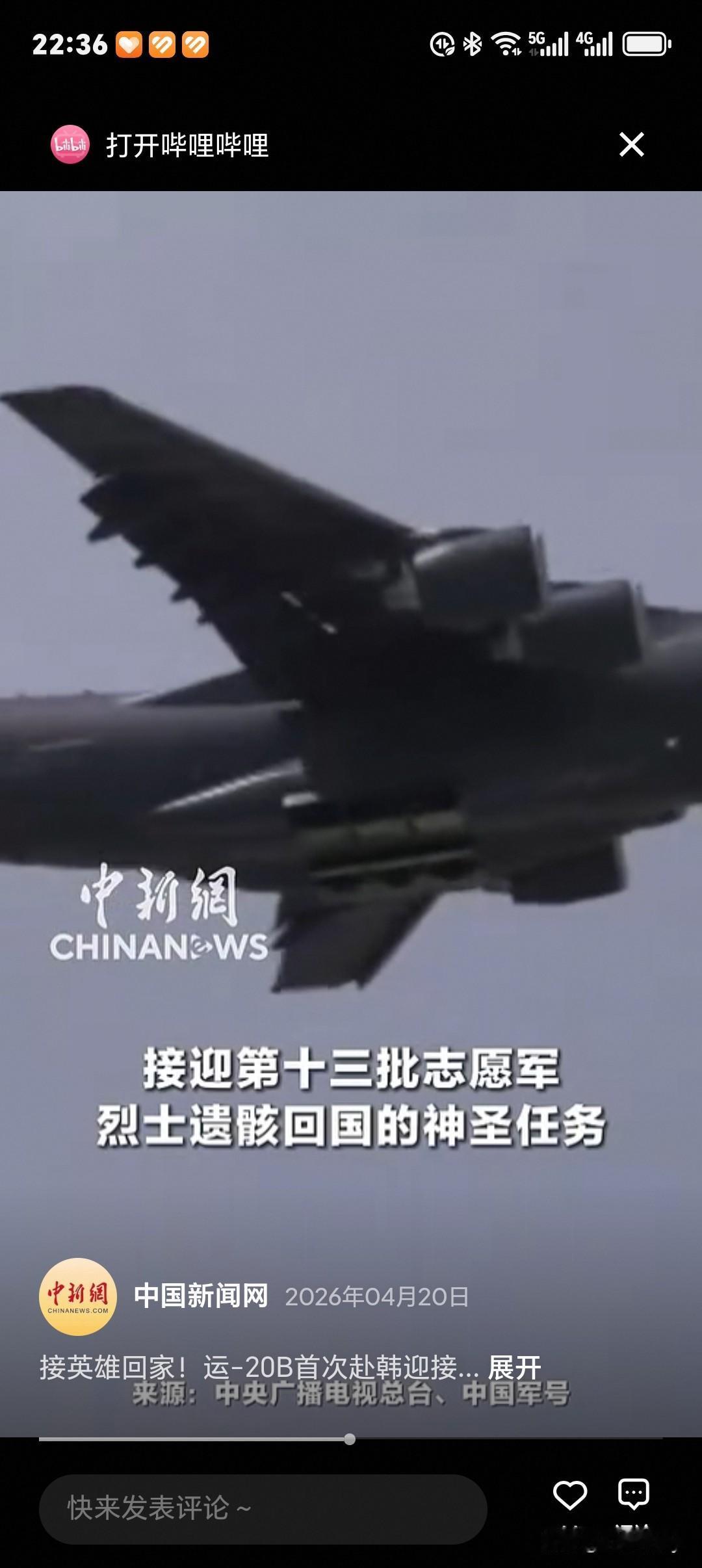 今天下午,中国空军一架运-20B大型运输机已起飞,前往韩国执行迎接第十三批在韩志愿军烈士遗骸任务。