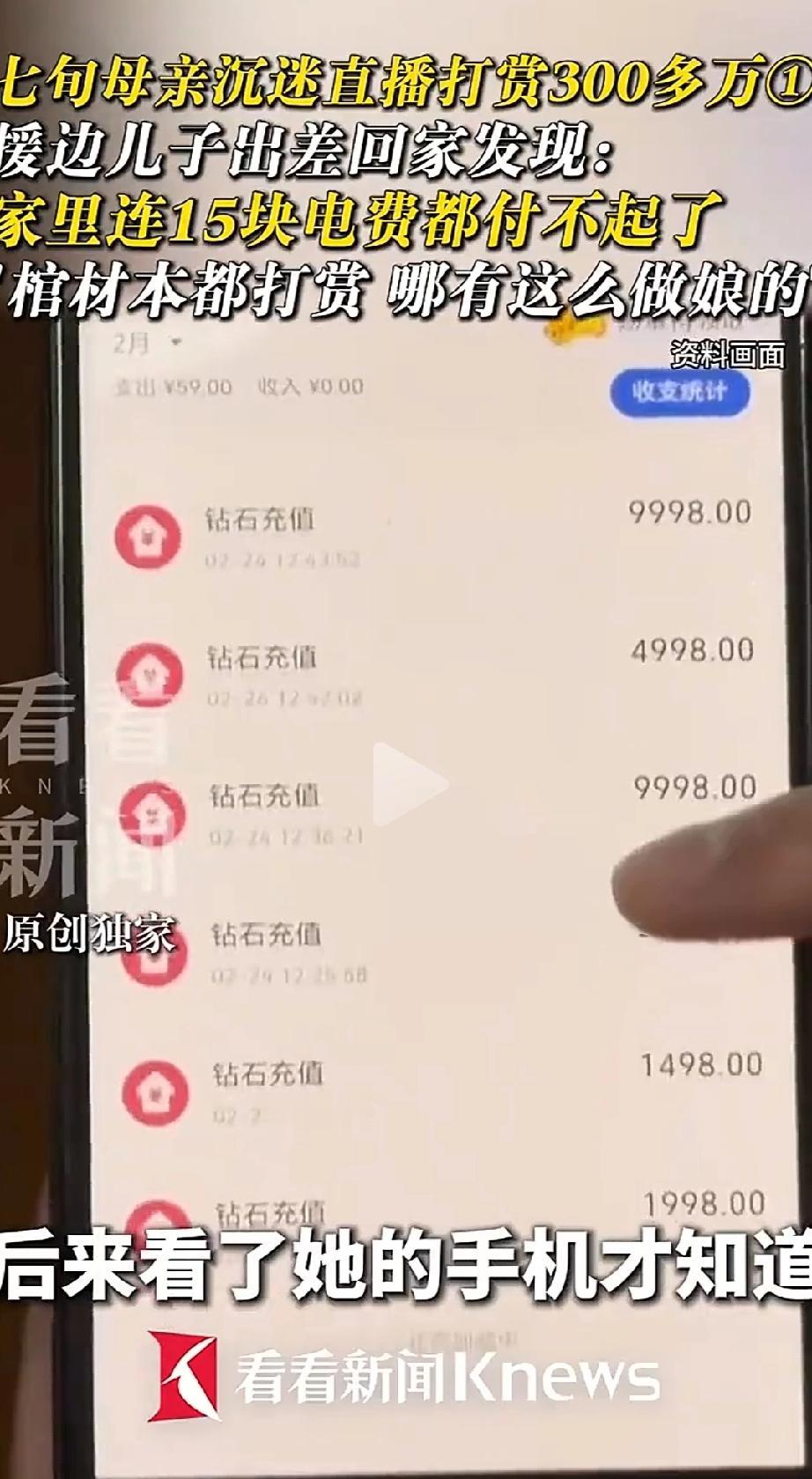 据王先生说,这几个月感觉母亲挥金如土。家里336万多积蓄全部打赏给主播了,月均开支超50万,最后连10到20元钱也想刷给主播。
