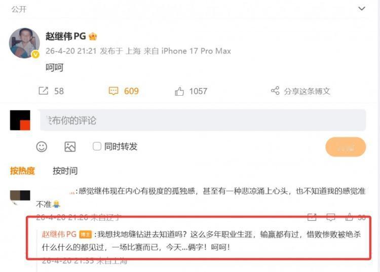 赵继伟则是在个人社交媒体发文,只写道两个字“呵呵”,这瞬间引起球迷的热议,纷纷揣测他的想法,大家是各执一词,随后不久本人也在评论区回应,解释道自己多年职业生涯,惜败、惨败和被绝杀都有经历过,但今天这场只能用俩字形容,看起来对于部分队友的表现和态度是极其失望。