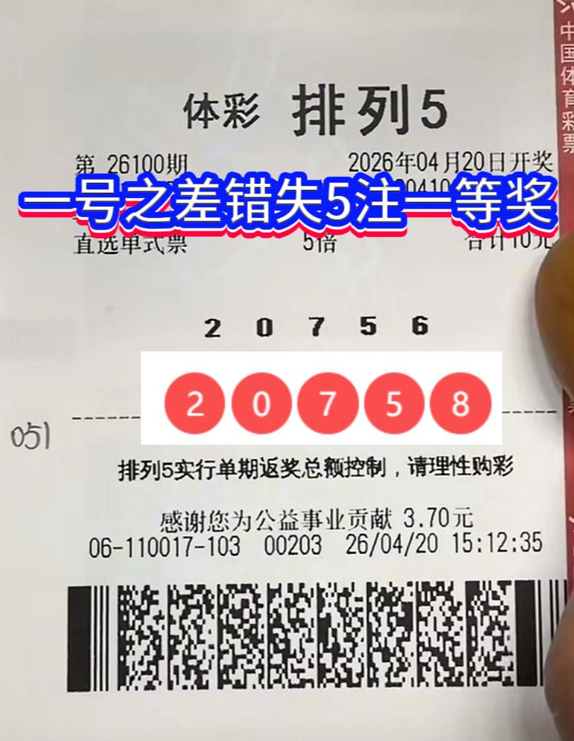 这位彩友买的排列五26100期5倍直选票,前四位2、0、7、5和开奖号码完全对上,偏偏最后一位选了6,而开奖号是8,就差这一个数字,直接错失了5注一等奖,整整50万奖金擦肩而过。
