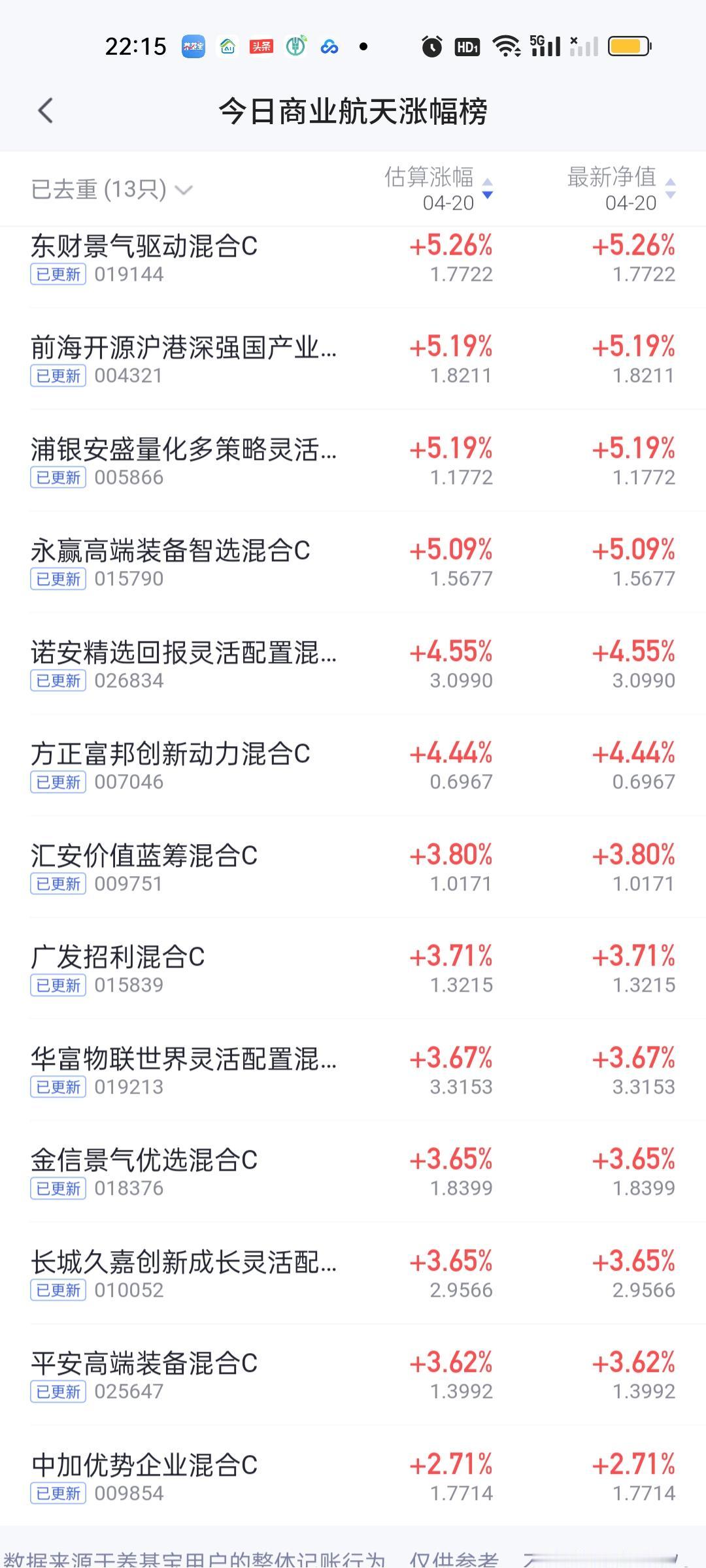 今日基金净值榜已更新完毕。涨幅榜方面,西藏东财景气驱动涨5.26%排名第一,前海开源沪港深强国产业和浦银安盛量化多策略5.19%排名第二,永赢高端装备5.09%排名第三,民生加银智造2025涨4.53%排名第四,方正富邦创新动力4.44%排名第五,东方阿尔法瑞丰和博时中证卫星4.43%排名第六。