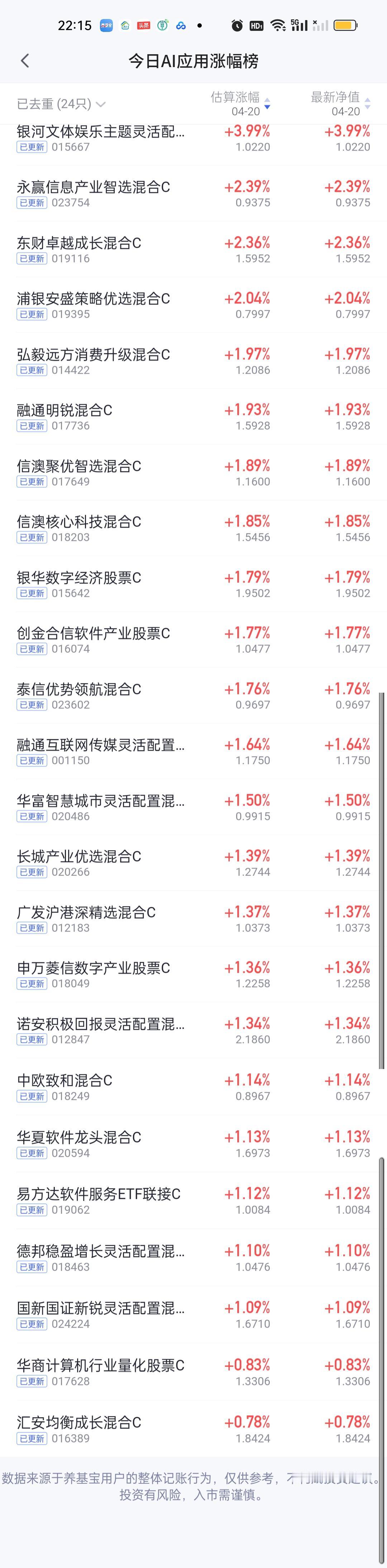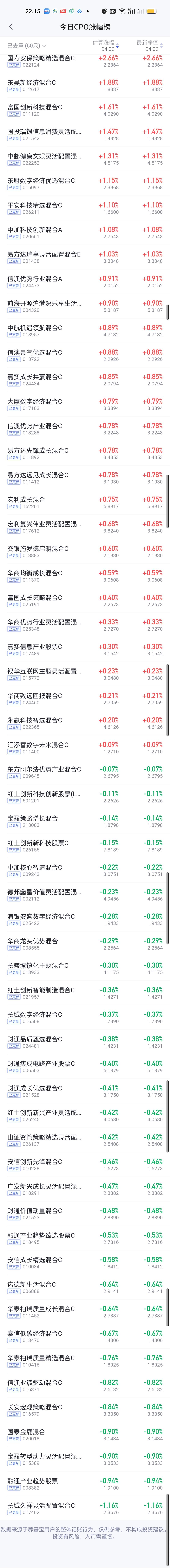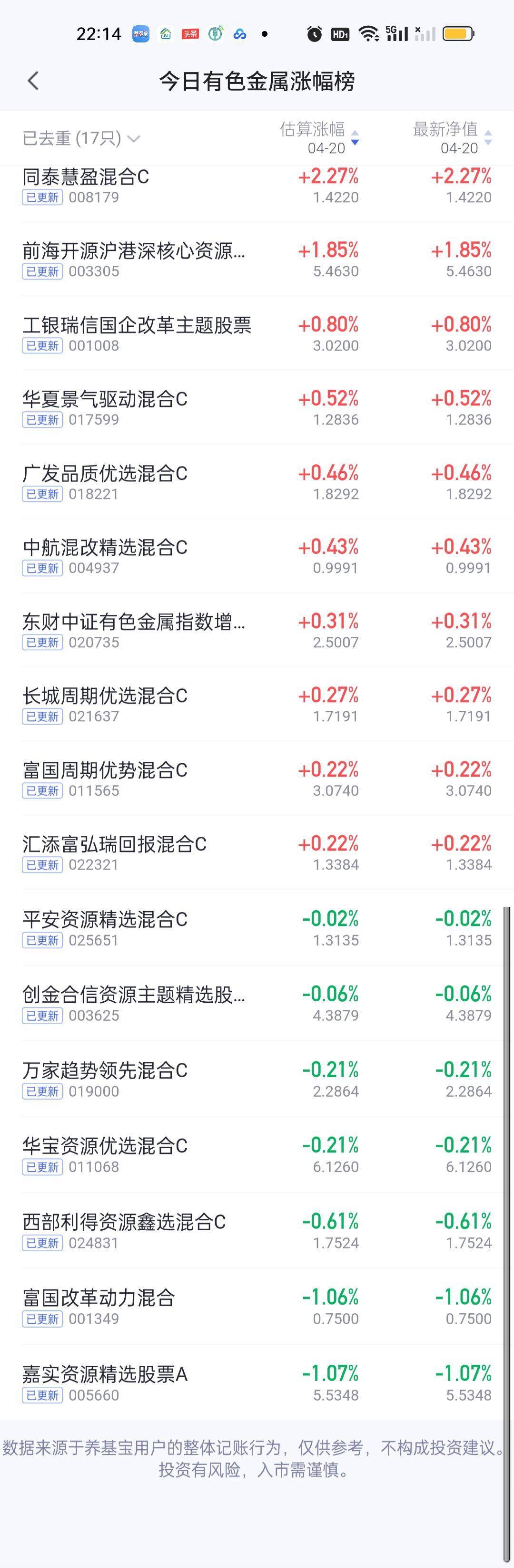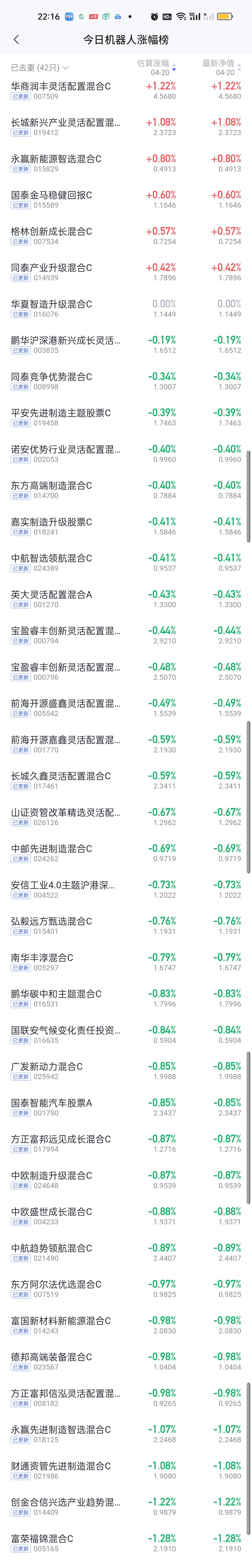 跌幅榜方面,永赢资源慧选跌2.13%排名第一,申万菱信医药先锋1.82%排名第二,中银大健康1.66%排名第三,国寿安保稳惠1.63%排名第四,建信易盛郑商所能源化工1.62%排名第五,国融融银1.60%排名第六。