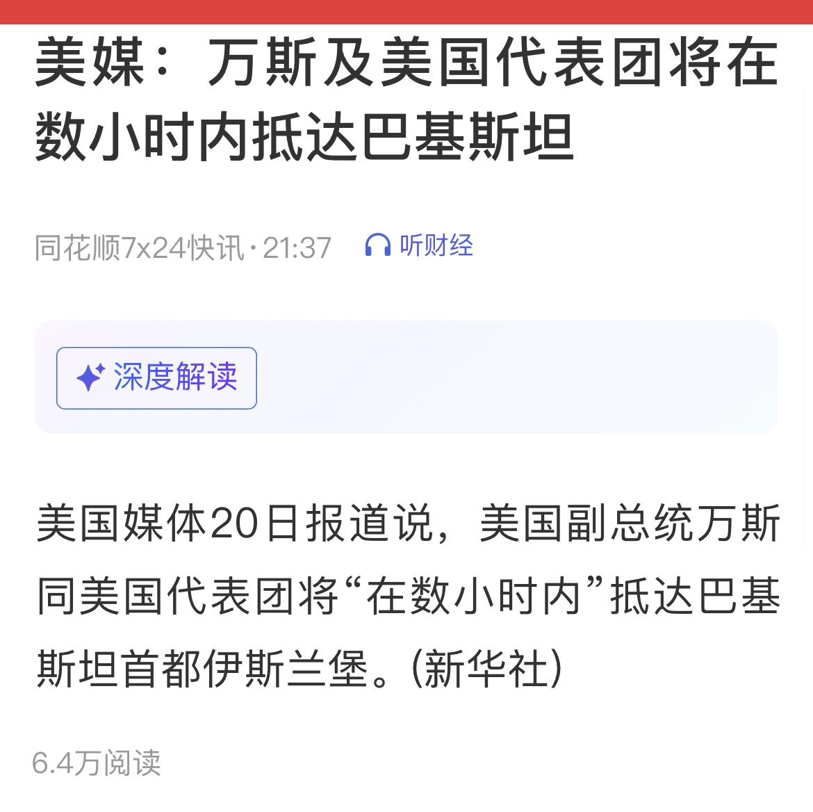 美媒:副总统万斯同代表团将“在数小时内”抵达巴基斯坦首都伊斯兰堡。