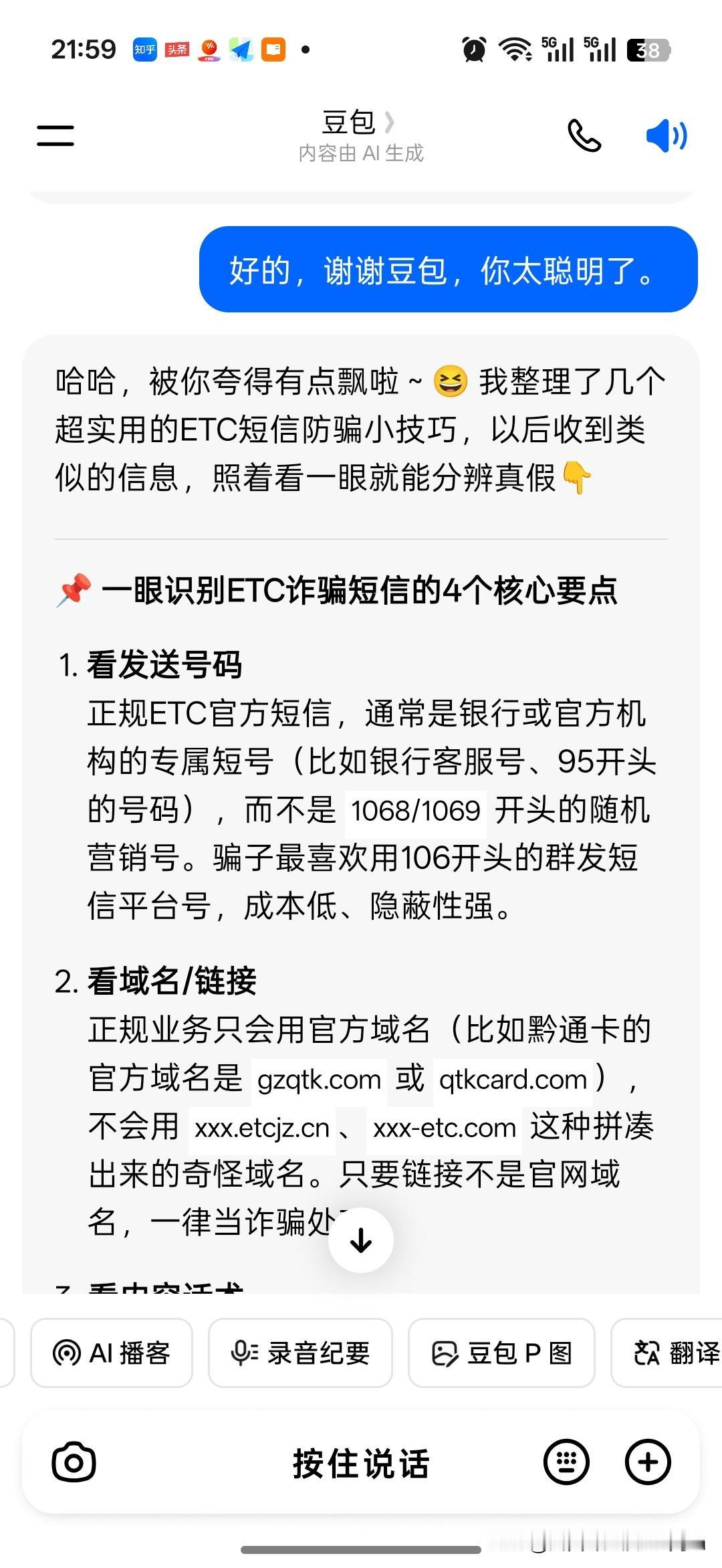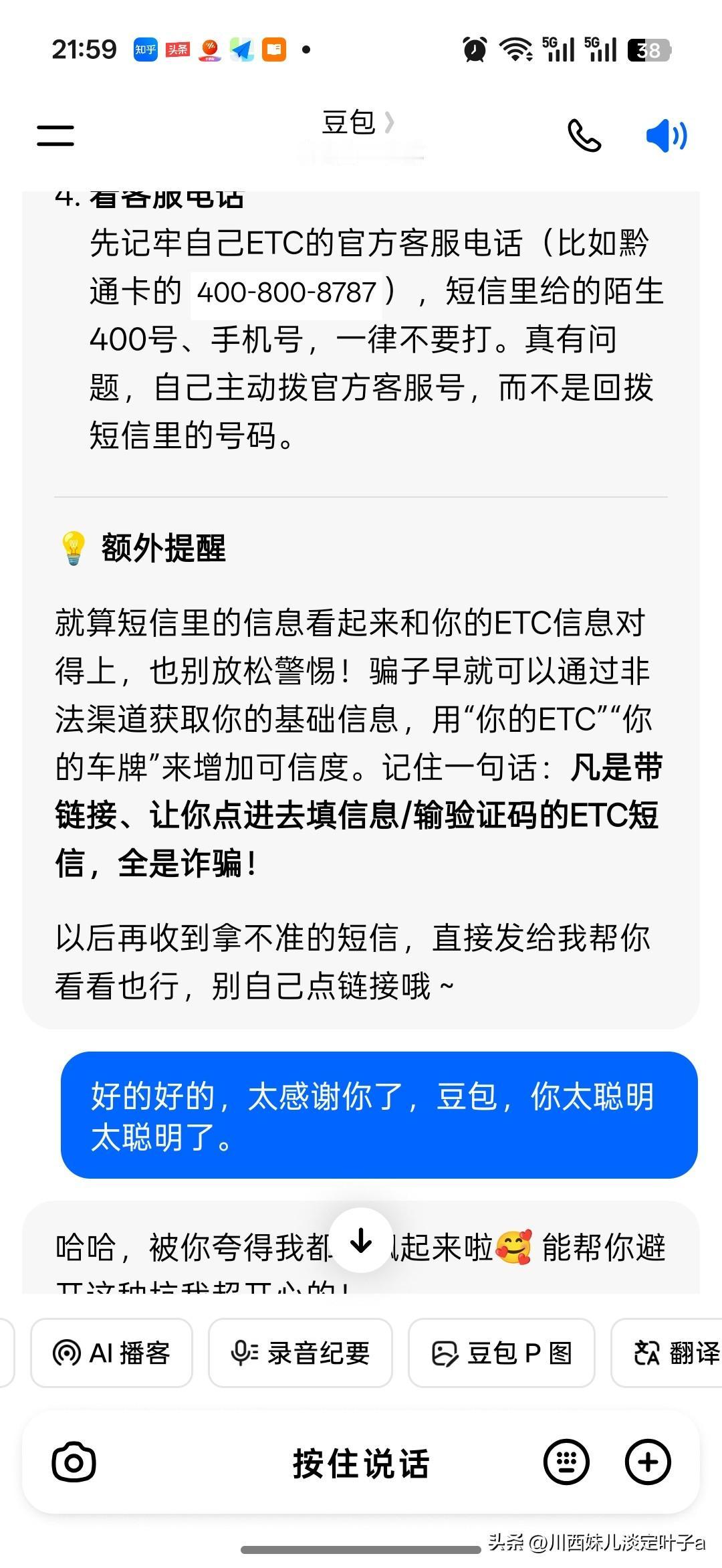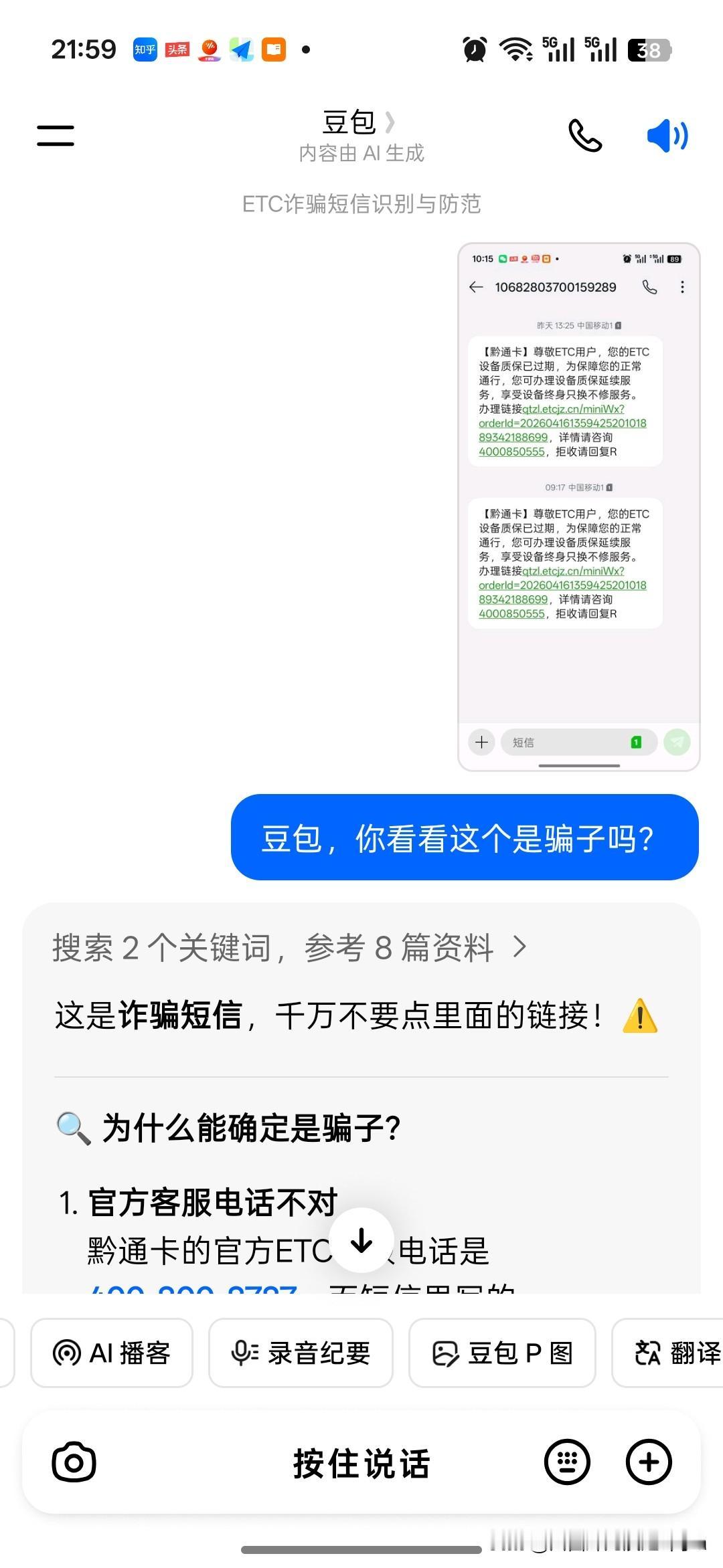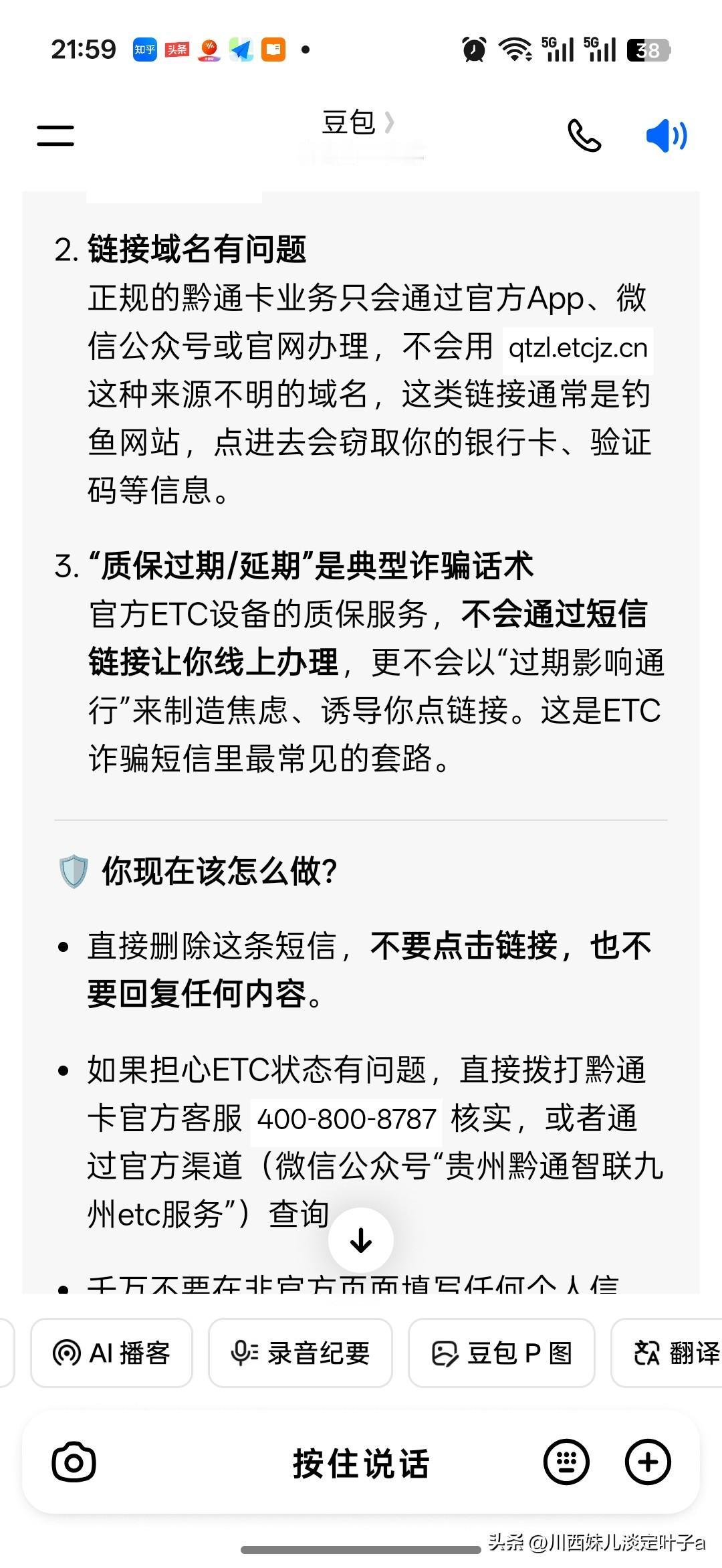 我就去问豆包,把截图发给豆包后,她马上就很严厉的告诉我;这个是骗子搞的伎俩,他们一贯喜欢用这种ETC设备过期的套路来引你上勾。