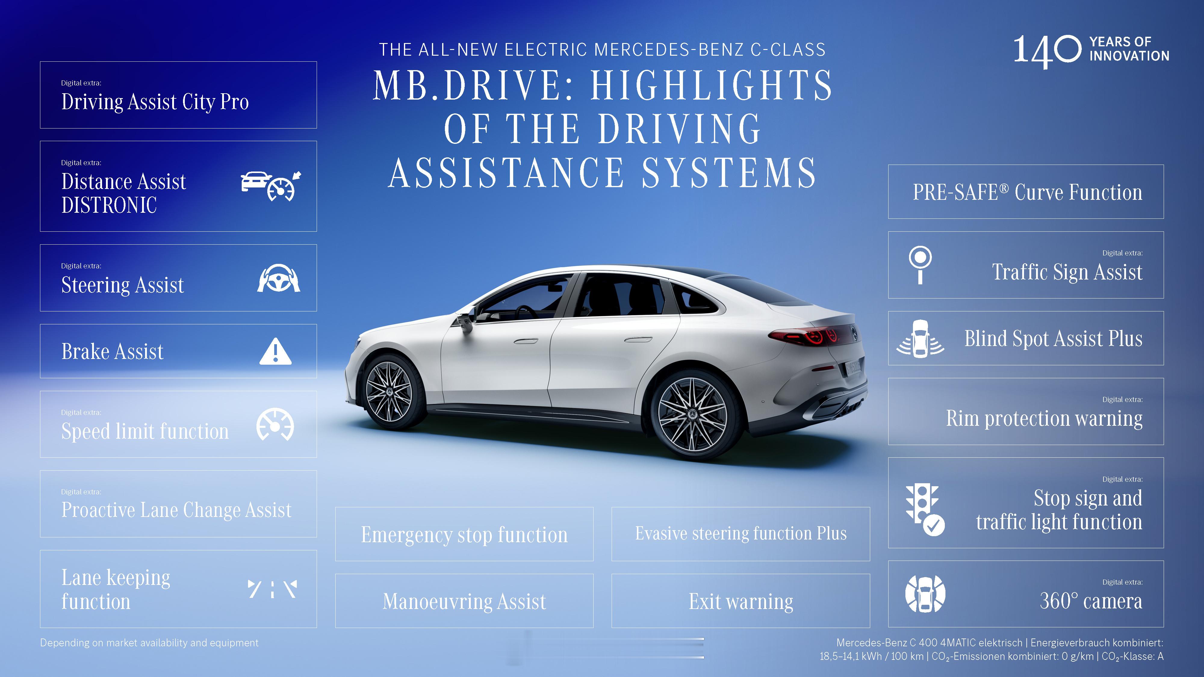 全新纯电奔驰 C 也具备点到点城区辅助驾驶,另外还基于导航引入 PRE-SAFE® 弯道功能。系统会根据导航数据预判前方弯道,若入弯速度过快,将通过收紧安全带给驾驶员物理提醒。