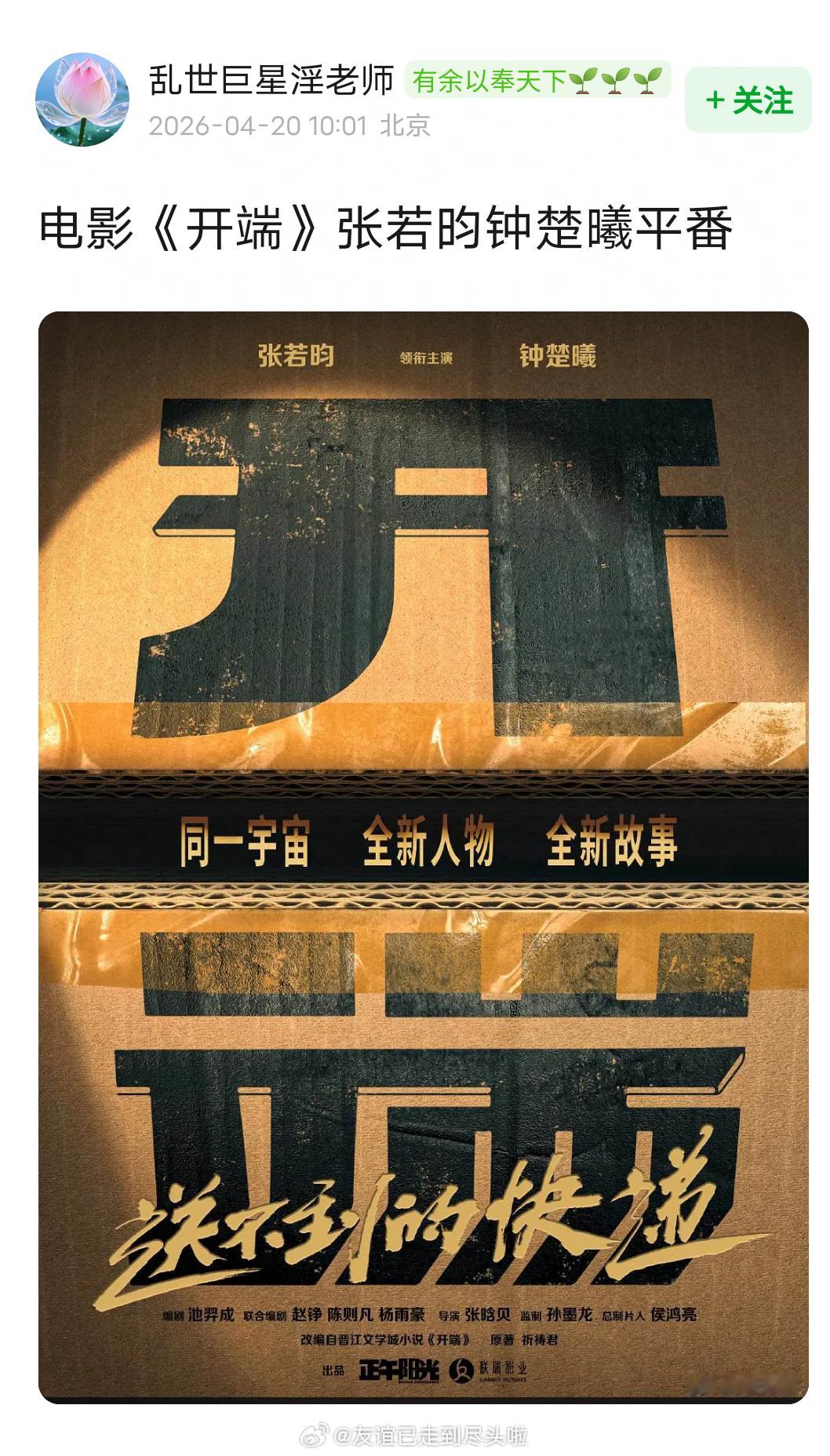 网友说影版开端张若昀钟楚曦平番,理由是官宣时两个人中间是顿号,表示并列。而且电影