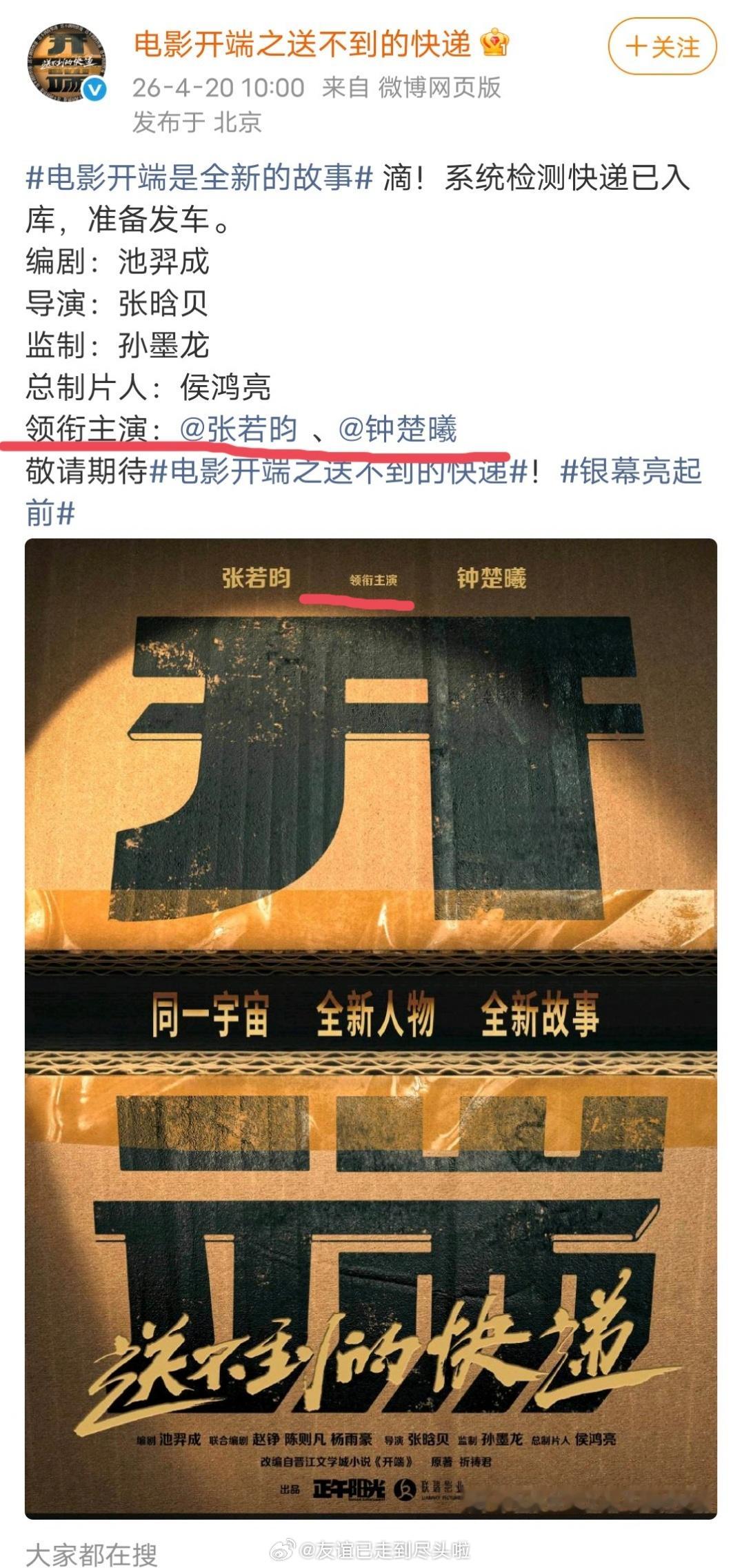 网友说影版开端张若昀钟楚曦平番,理由是官宣时两个人中间是顿号,表示并列。而且电影海报领衔主演在男女主演中间,还设计成了轴对称。不是有括号才算平番吗?这个很明显的一番二番电影开端之送不到的快递