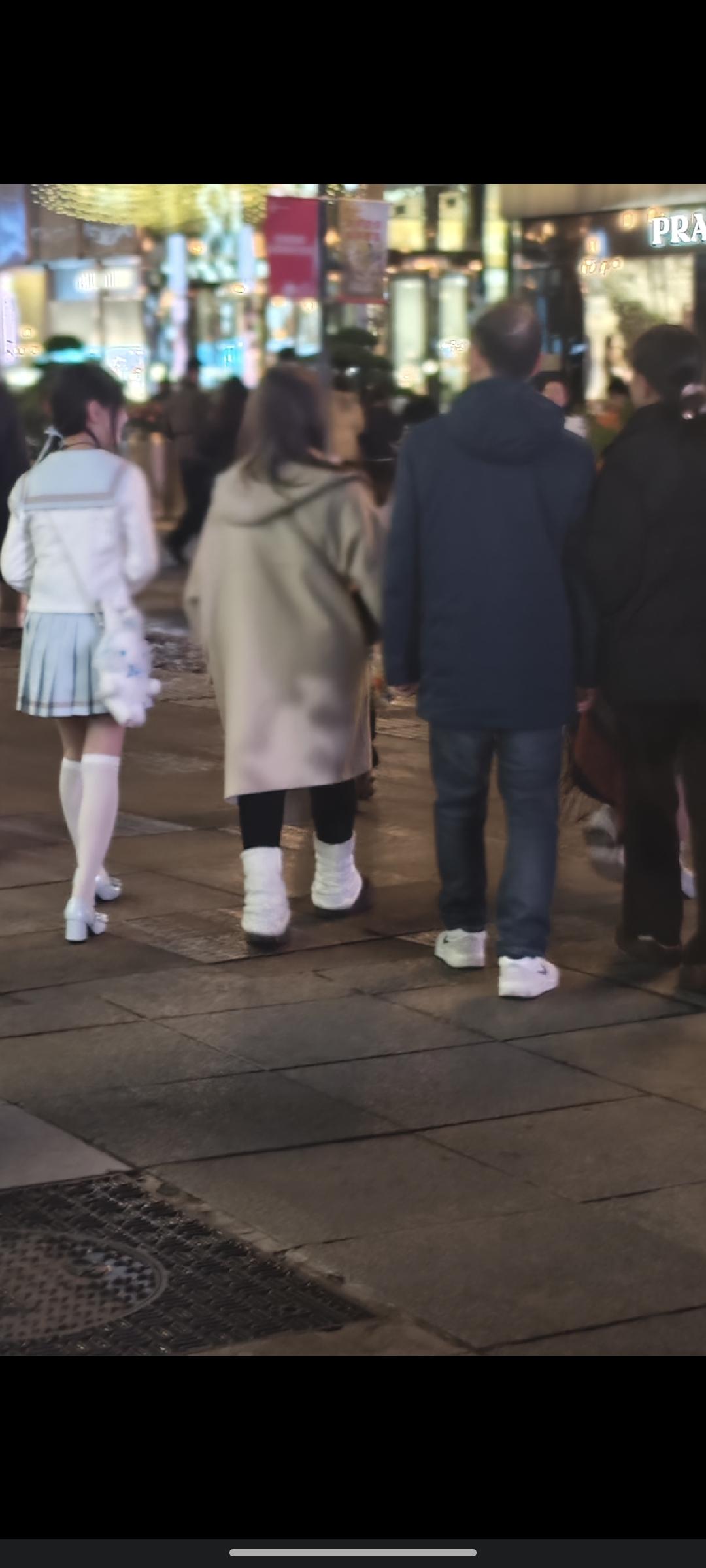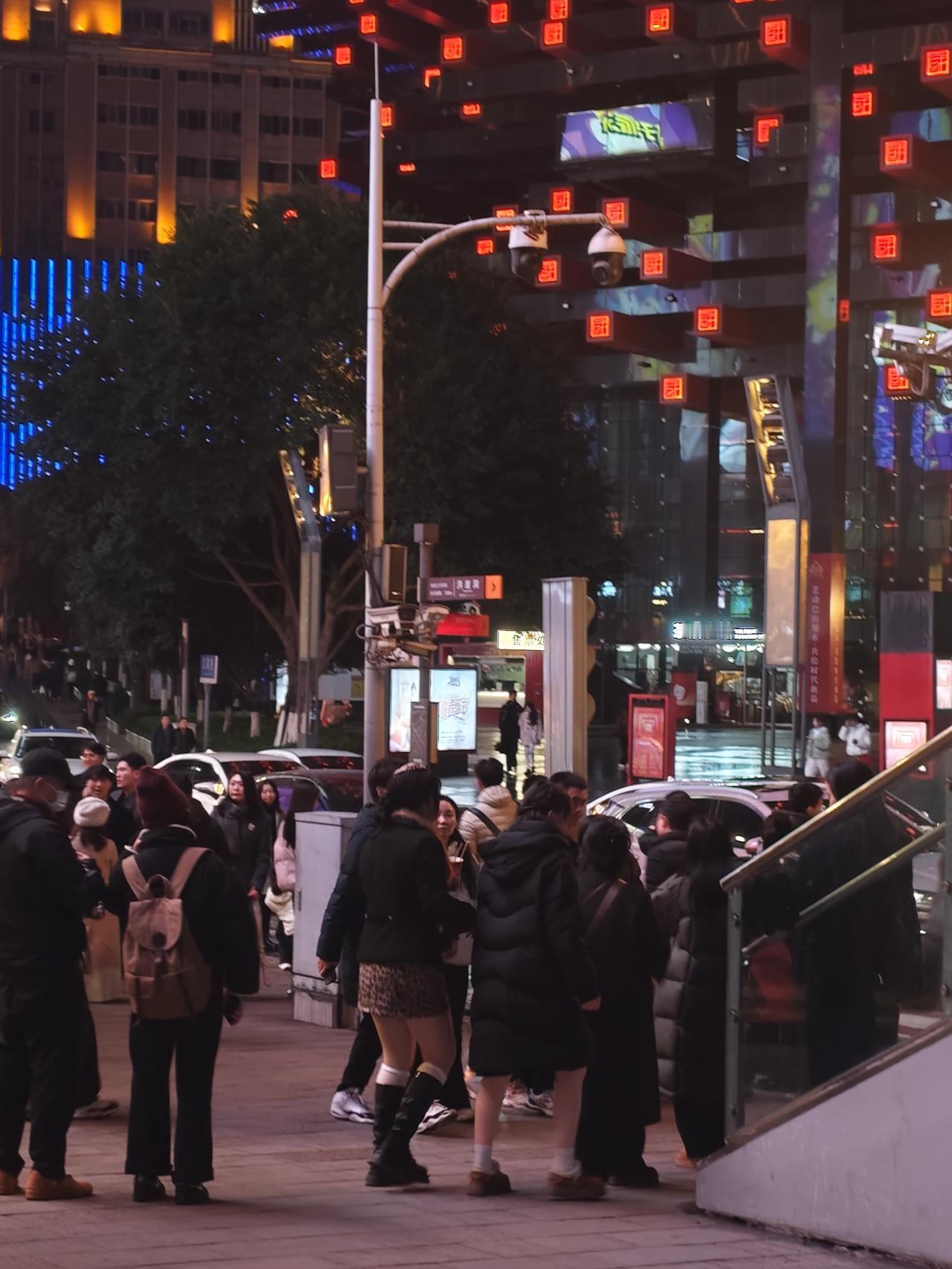 十二月三十一日跨年夜,外地游客在解放碑跨年时,许多人还穿着裙子,当天气温十到十二度。